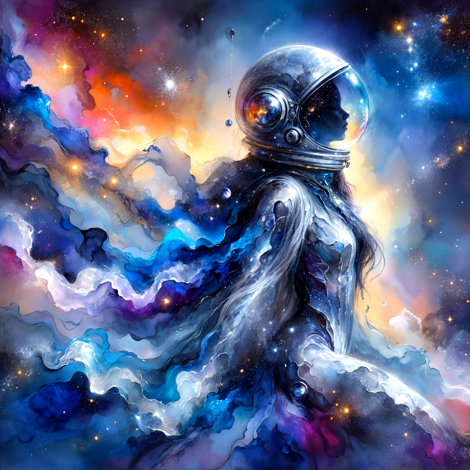 Prompt: A vibrant, expressive abstract painting in mixed media — ink, watercolor, and bold acrylic splashes — depicting a female astronaut drifting weightlessly through the cosmos. Her body arches gracefully as she floats in zero gravity, wrapped in a sleek, form-fitting spacesuit that shimmers with shifting shades of silver, cobalt, and deep midnight blue. The suit gleams with iridescent highlights, reflecting the glow of distant stars like liquid light across her silhouette. Her helmet visor glows faintly, catching bursts of starlight and swirling nebula hues. Loose, gestural brushstrokes and blooming watercolor textures merge with ethereal clouds of cosmic color, blending her figure into the vast expanse of space. Strands of her hair, visible through the translucent helmet, drift like trails of ink and violet mist, dissolving into a dreamlike sea of luminous blues, silvers, and golds. The background erupts with abstract celestial energy — pools of indigo, amethyst, and pearl merging with soft greys and radiant bursts of starlight — evoking the sensation of infinity, serenity, and the transcendent motion of the universe.