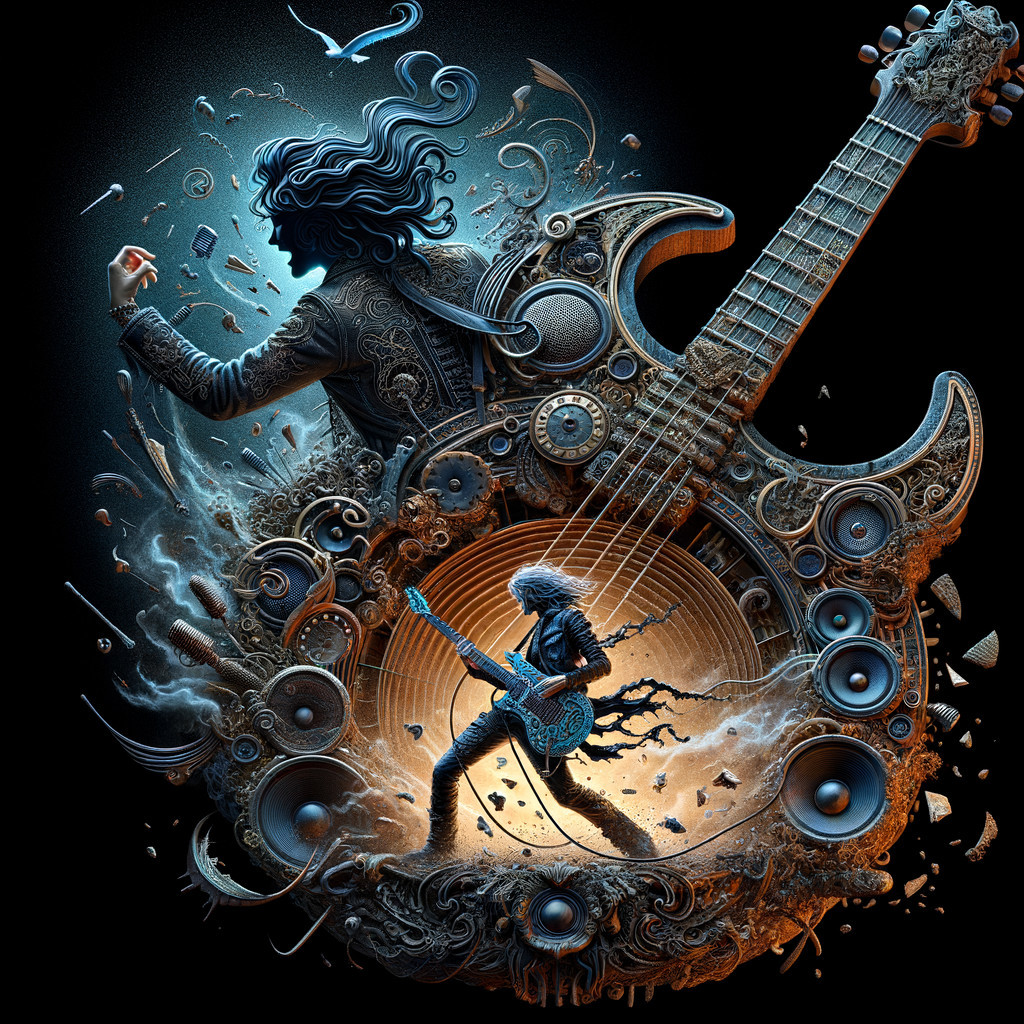 Prompt: A stunning, highly detailed and intricate 3D Olivia De Berardinis’ provocative style of a double exposure digital artwork. A striking silhouette of an intricately designed electric guitar revealing a breathtaking scene within. This inner guitar depicts a scene of a fierce rocker woman, standing aggressively playing an intricately designed electric guitar, blasting music notes like a swirling tempest. The sheer power of the huge, towering speakers is pushing her backward as buffeted by the storm. Her flowing, raven-black hair and intricately embroidered, weathered leather jacket and pants are blown back by the turbulent power of the speakers. The background is a chaotic tapestry of debris-filled air, with shattered glass, splintered wood, and torn fabric flying around her, illuminated by an eerie, pulsing glow. The scene is rendered with exquisite detail, featuring lifelike textures, vivid color gradations, and atmospheric lighting, evoking a blend of Olivia De Berardinis' exotic touch, Thomas Kinkade's shading, Greg Rutkowski's symbolism, and Alphonse Mucha's lines. The 3D backdrop consists of intricately designed super-sized speakers against a black and grey shaded background, accented with white curving lines.