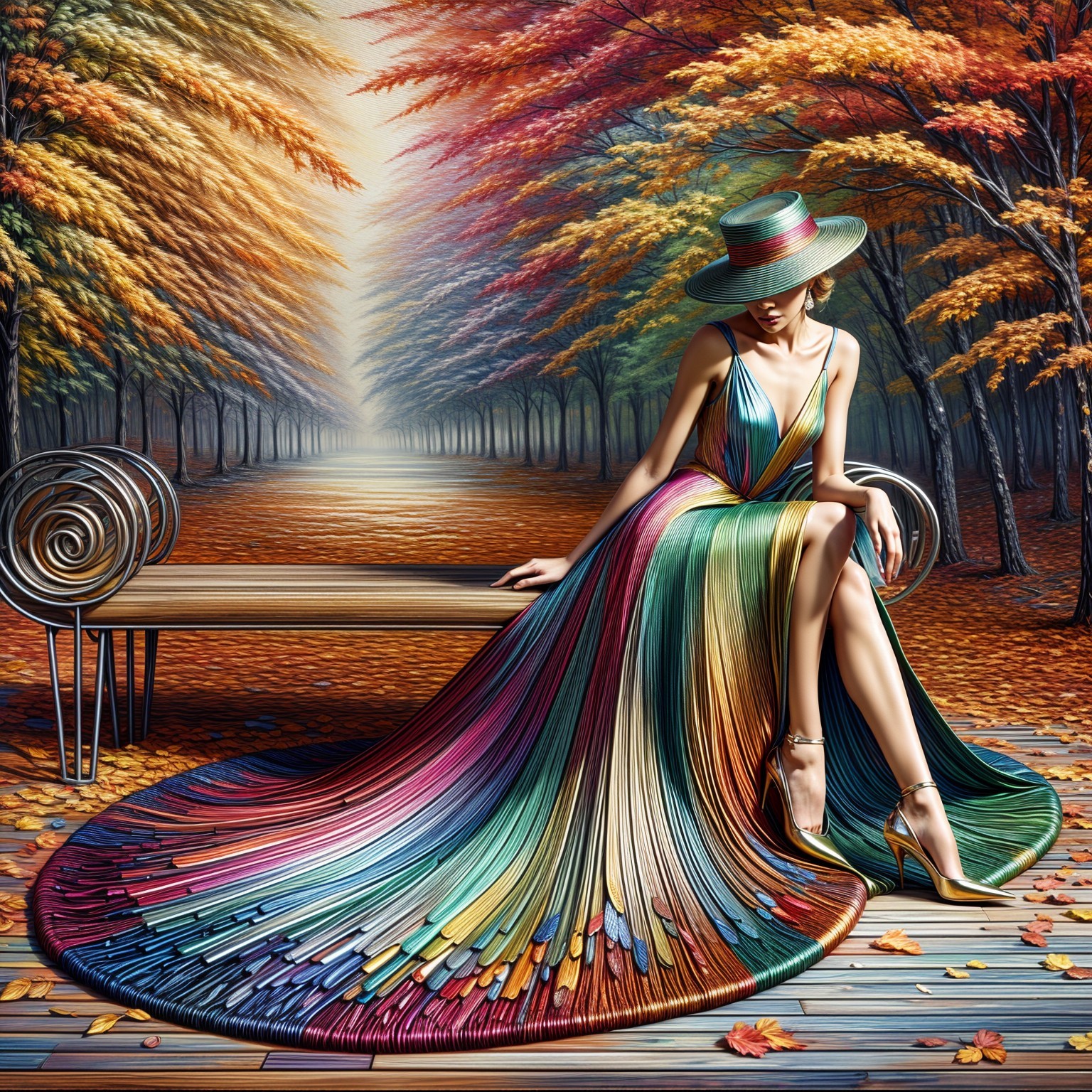 Prompt: Autumn landscape theme, vibrant and radiant 3D digital art painting mixed with very wet oil paint and fine, iridescent textures, depicting a large portrait of an elegant young Caucasian woman wearing a long, flowing, sleeveless evening gown made of very fine strips in shimmering, iridescent colors (blue, golden yellow, green, pink, mauve – playing with slightly thick 3D textures), a wide-brimmed boater hat matching the dress, and earrings. The bottom of the dress reveals a slender foot in an elegant gold pump (very fine dot textures), and the rest of the dress trails gently on the floor. She is seated, one knee bent over the other, in three-quarter view on a brown wooden bench with silvery-grey highlights and a stylized silvery-grey steel armrest, one arm resting on her bent knee while the other is raised to just below her chin, seemingly savoring the last glimmers of an autumnal landscape in a magnificent park.