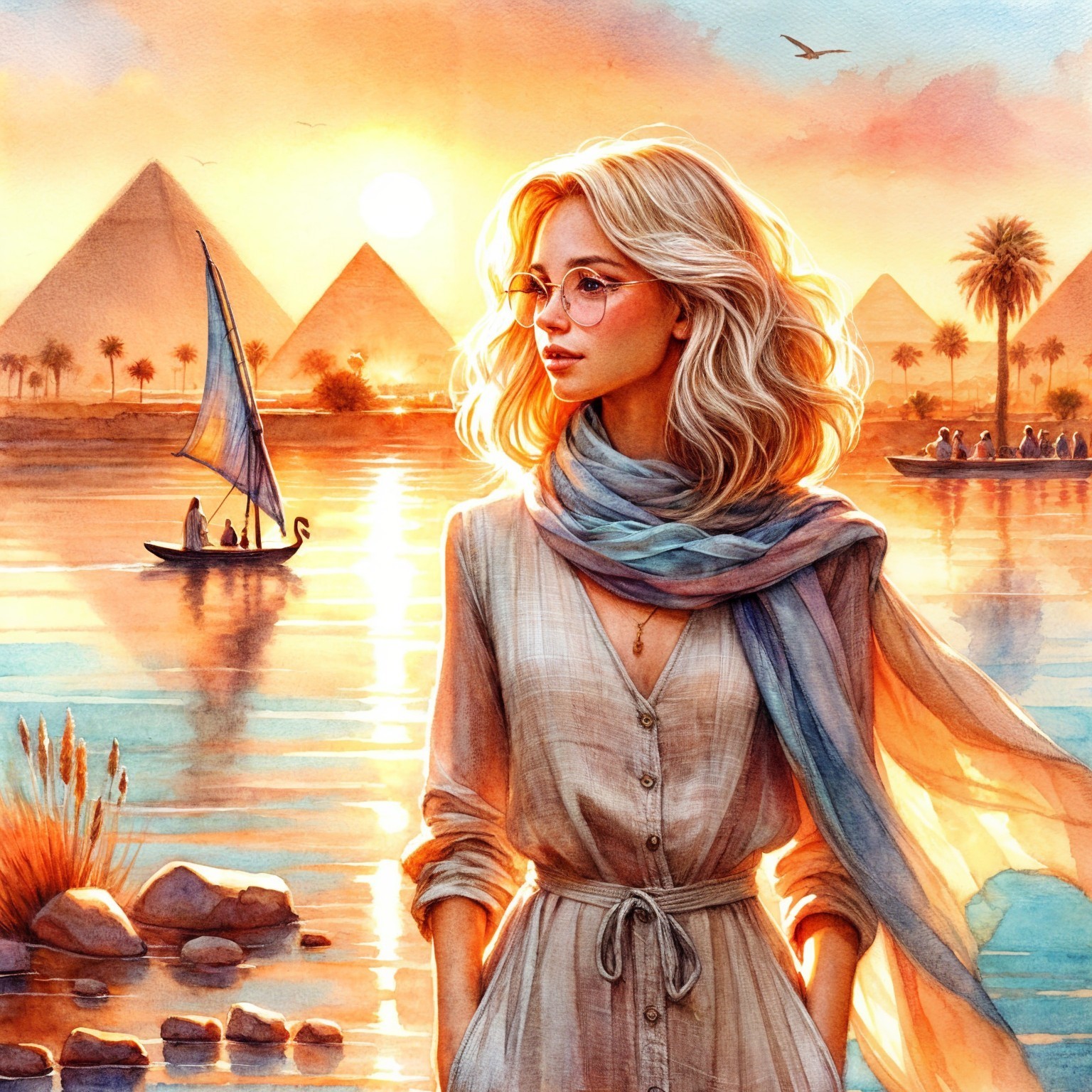 Prompt: Soft watercolor illustration of a blonde woman with pink glasses standing near the Nile River at sunset. Behind her rise the pyramids of Giza, bathed in golden light, while the calm water glows with reflections of orange and blue. She wears a light linen dress and a scarf that moves softly in the warm desert breeze. Palm trees sway in the distance, and a small felucca boat drifts gently on the river. The atmosphere feels timeless and sacred — history, sun, and serenity captured in watercolor.