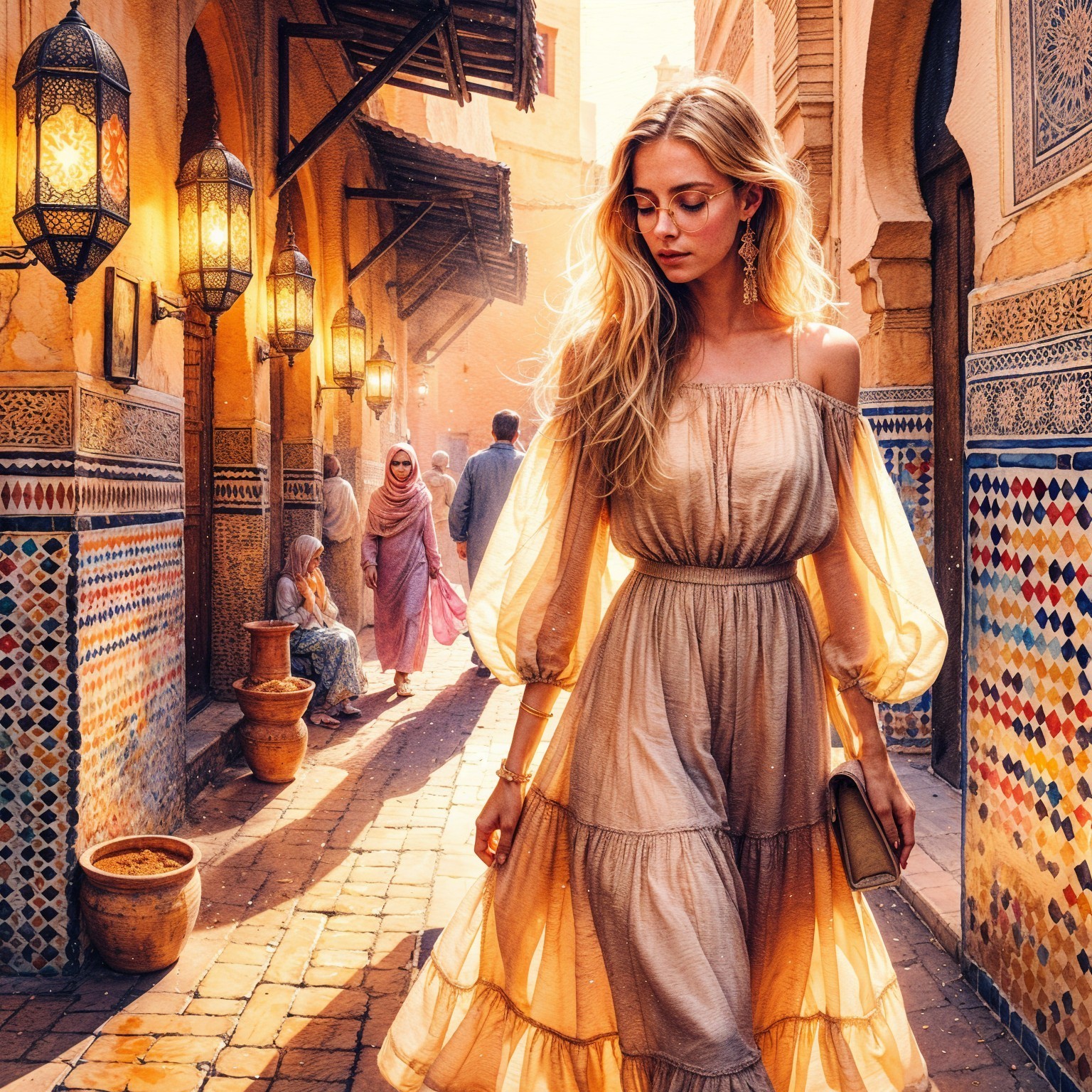 Prompt: Soft watercolor illustration of a blonde woman with pink glasses walking through a narrow street in Marrakesh, surrounded by the warm glow of hanging brass lanterns. The golden evening light reflects on colorful mosaic walls and patterned fabrics. She wears a light, flowing dress with covered shoulders and soft sand-colored tones. Around her, the air shimmers with spice dust and gentle shadows from carved lamps. The atmosphere feels alive, glowing, and timeless — the heartbeat of Morocco in watercolor.