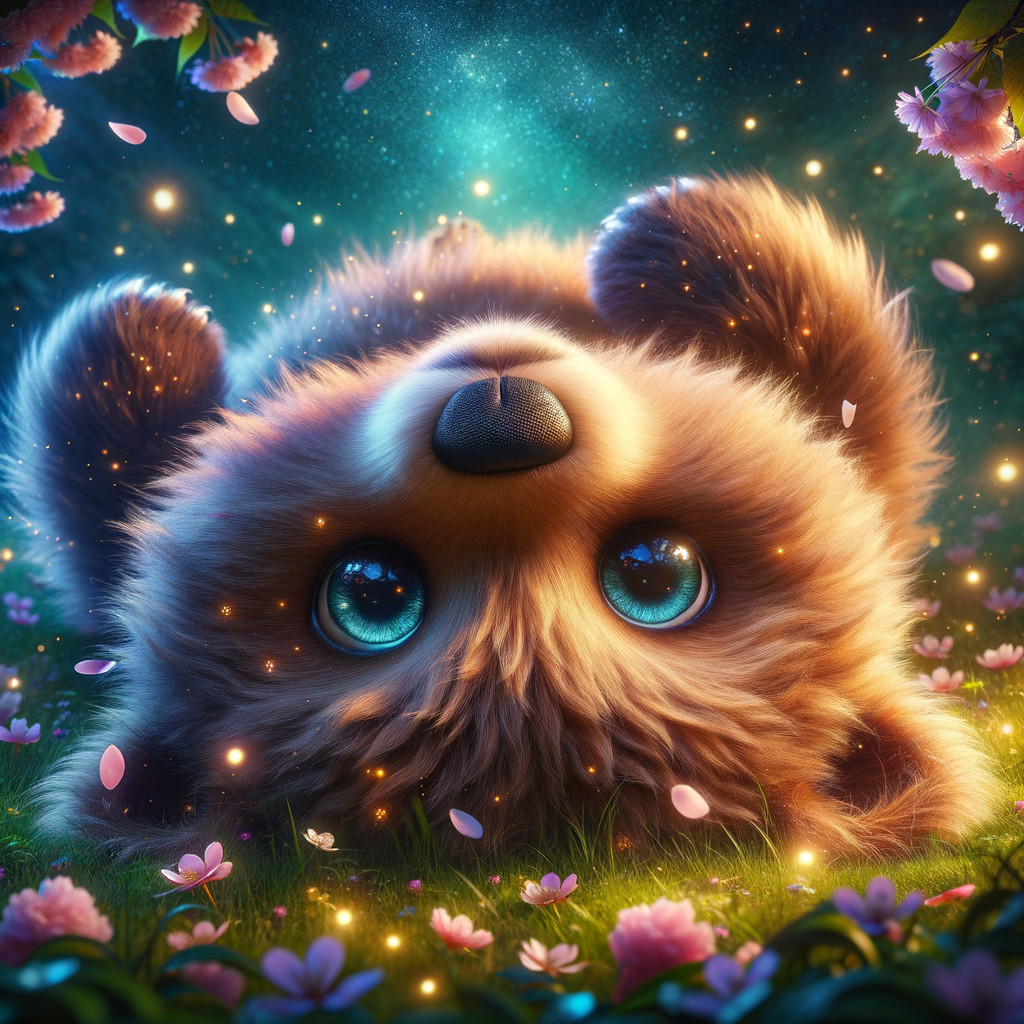 Prompt: A hyper-realistic digital artwork of an adorable, cute, fluffy bear laying upside down on soft grass, looking directly at the viewer with big, expressive blue eyes. The bear's fur is dense and textured, intricately detailed, shimmering with tiny fireflies under a dimly lit night sky. Delicate sakura petals drift around the bear, creating a magical, serene atmosphere. The scene is set in a vibrant garden filled with colorful flowers, bathed in soft, dappled moonlight with a gentle bokeh effect. Inspired by the digital painting style of WLOP and Guweiz, emphasizing ethereal lighting and stunning detail.