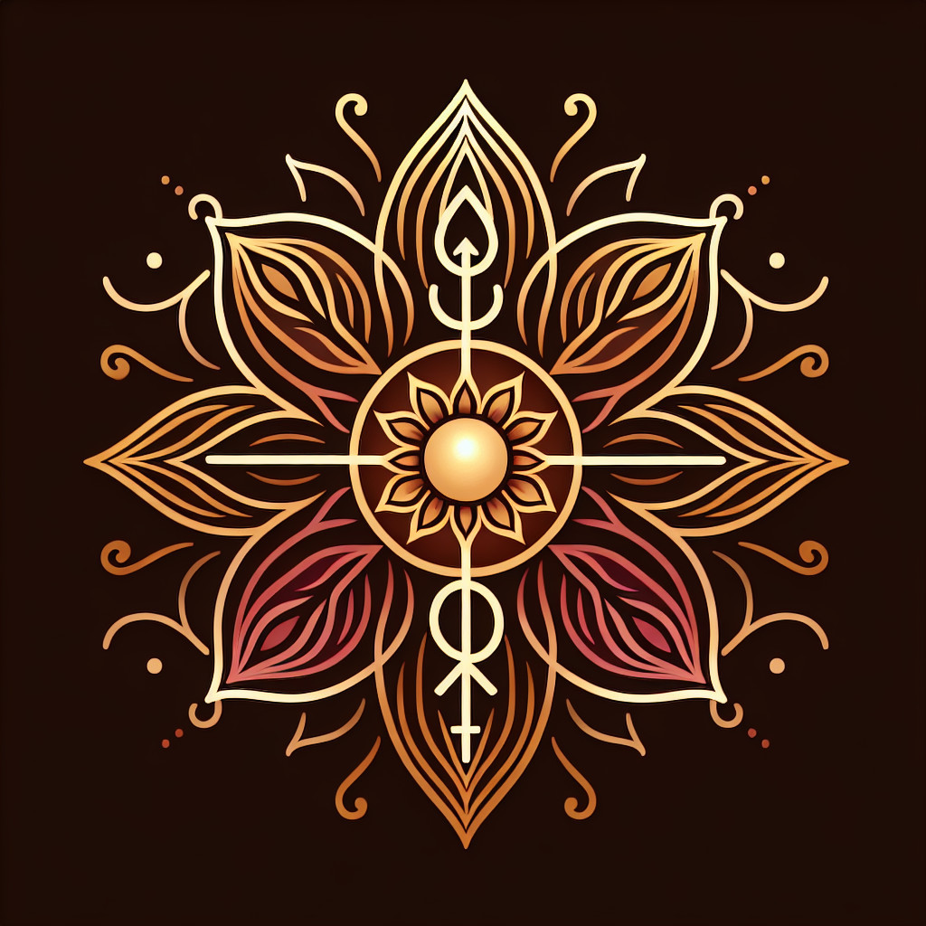 Prompt: A simple lotus or mandala made of two interwoven lines, one representing masculine energy, one feminine, meeting at a central point of light.