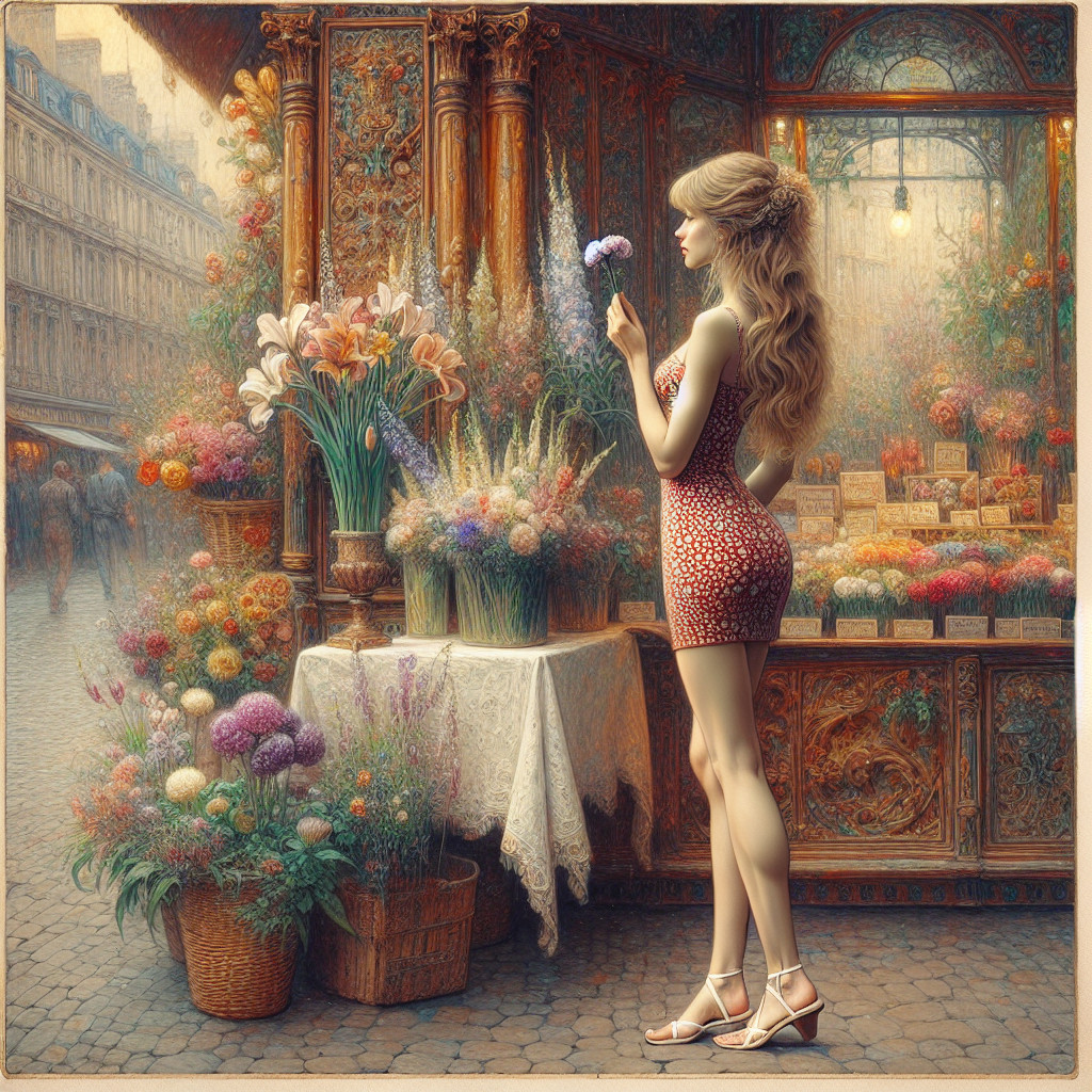 Prompt: A tall thin woman with long legs wearing a tight short red and white polka dot dress, standing at a florist shop smelling the flowers, long wavy blond hair, white sandals, colorful, intricate surroundings, heavy fading at the edges, soft and romantic, impressionistic, dreamy, vintage.