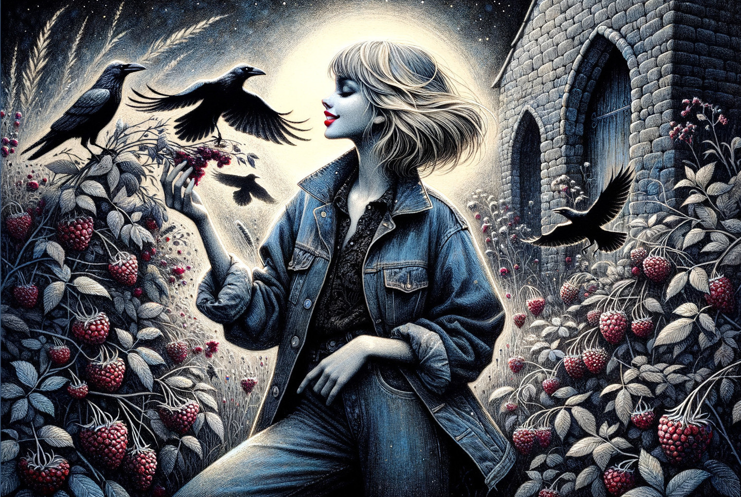 Prompt: Masterpiece, a delicate ink and watercolor wash rendering on rough handmade paper. A gothic surreal portrait of a blonde woman with a shoulder-length bob and red lips, her face merging with palette knife textures, black ink, and silver foil. Moonlit, surrounded by ravens and crimson leaves — a fusion of realism and abstract gothic depth. stands in the overgrown garden of an old brick church. Her hair is styled normally with loose tendrils framing her face, rendered with soft, flowing ink strokes and sun-kissed washes of honey and wheat. She wears a blue jeans jacket and wide-leg jeans with Chucks, suggested by textured ink lines and washes of indigo and slate. With a joyful expression, she picks the last dark red raspberries from a wild flower bed that has passed its prime, the wilting blooms and berries evoked through energetic ink splatters and rich crimson, burgundy, and faded green washes. The background features the skyline of a major European city, lightly sketched with irregular lines and muted tones of grey and ochre. Towards the edges of the canvas, the image dissolves into chaotic shredded collage techniques inspired by Mimmo Rotella—loose squiggly lines, scattered scraps, dots, blots, and color clouds created with overspray and splatters of vibrant watercolor. The mood is a blend of urban vitality and nostalgic melancholy, capturing a fleeting moment of seasonal change with raw, expressive artistry. evocative, dynamic, gritty, intricate, elegant, award-winning, ultra-detailed, high definition, crisp quality, watercolor, ink, rich colors, graceful, screen-filling, atmospheric.