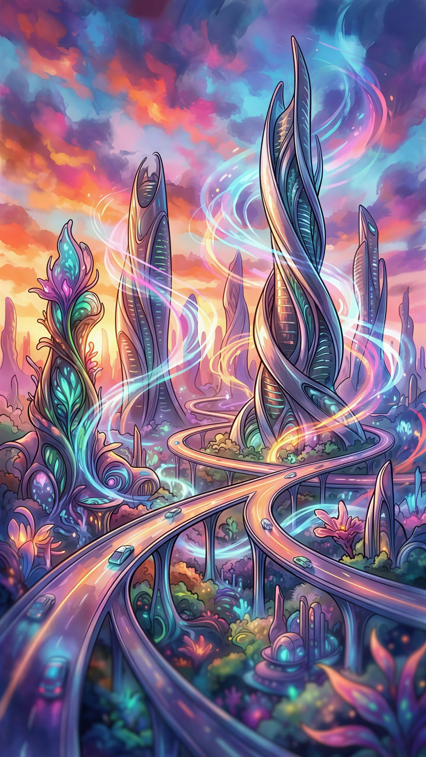 Prompt: A vibrant, surreal landscape depicting a futuristic city with intricate, swirling architecture. Majestic skyscrapers rise into a colorful sky filled with dramatic clouds transitioning from warm oranges and pinks to cool blues and purples. A complex network of highways winds through the scene, with cars moving along the roads. The atmosphere conveys a sense of movement and energy, enhanced by luminous, flowing patterns reminiscent of abstract art. The overall composition evokes a dreamlike quality, blending elements of nature and urban design in a harmonious, fantastical vision, masterpiece, expressionistic, crisp quality, hdr, dof, fantasy, trending on Artstation.