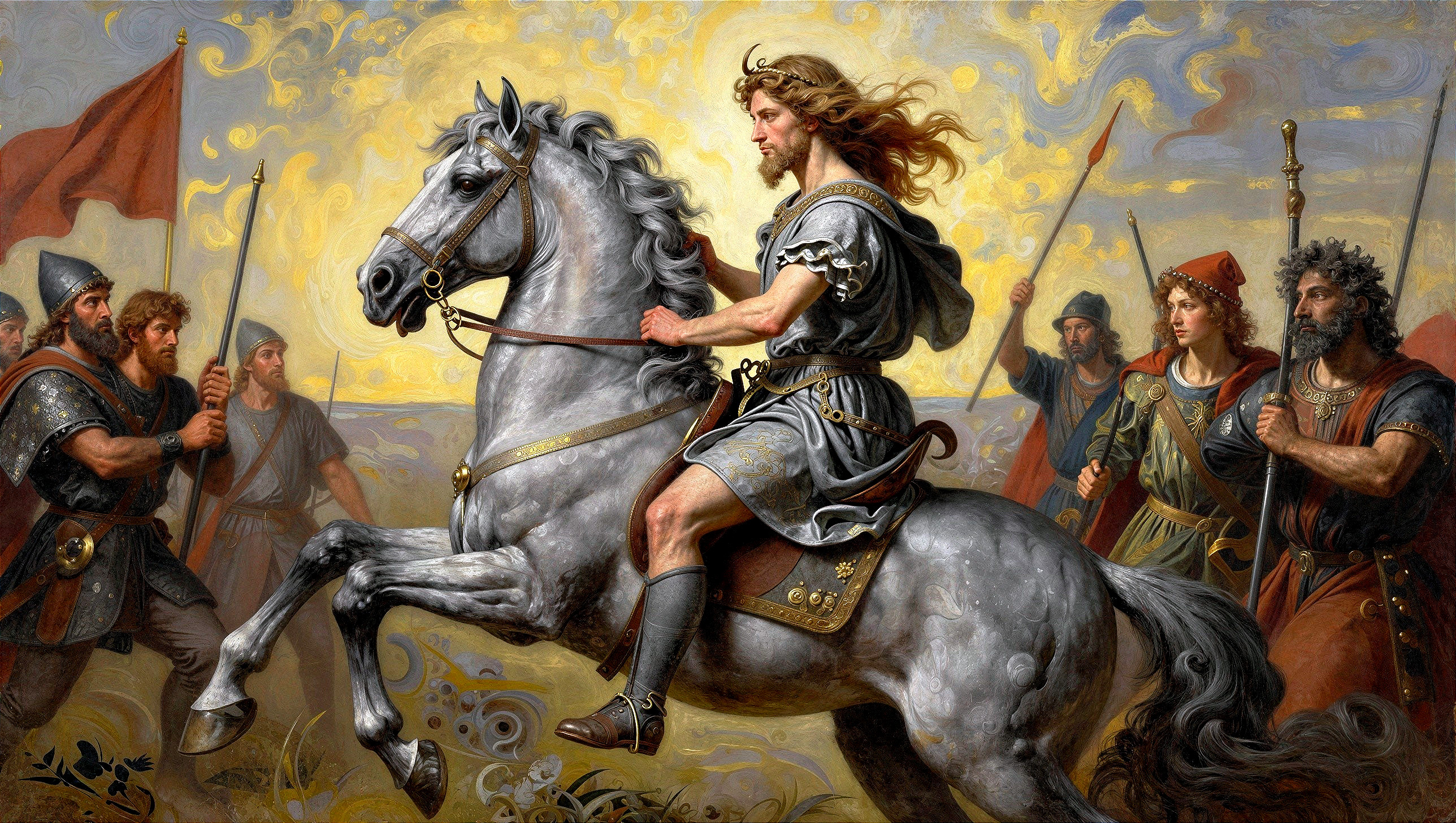 Prompt: A beautiful oil painting of Lucifer riding a horse in battle against the Crusaders, intricate facial features, realistic texture on clothing, The Characters has an intricate texture, with detailed hair and beard, The overall color palette consists of shades of gray, and warm yellow tones, 16:9 aspect ratio, 8k resolution, no frame, hyper-realistic style, vibrant colors, natural lighting, digital artistry.Michelangelo, quilling, John William, Waterhouse, leonardo da vinci, Caravaggio, Greek methodology, Perfect Anatomy, Frederick Leighton, lord frederick leighton,masterpiece