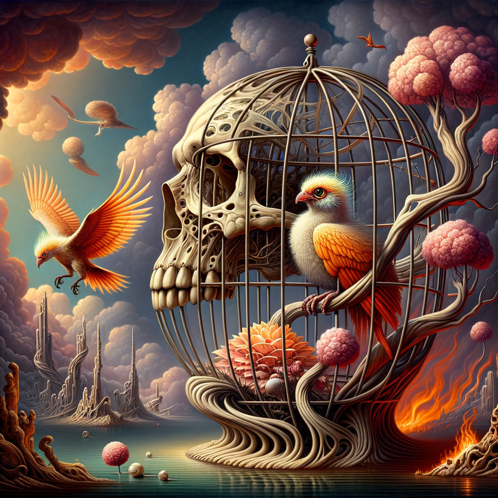 Prompt: fantasy rococo figured сage woven from steel rods in the shape of a skeleton-carcass-skull [cage bars are curved to the shape of 3D carcass skull-model] and little fire-fluffy phoenix-chick with huge glowing eyes and blooming burning branch-perch inside cage, oil on canvas, surrealism; in style of Codex Seraphinianus, Codex Voinich, Escher, Remedios Varo, Michael Cheval; A masterpiece; volumetric lighting