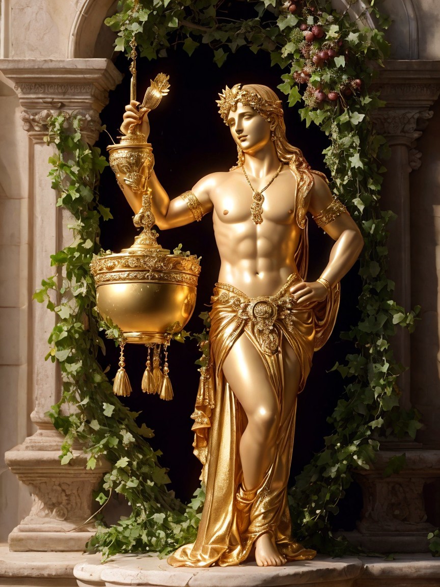 Prompt: A divine scene of God Dionysus, adorned with grapevines and ivy, raising a goblet of glowing Nectar. Around him, mythological dancers in flowing robes twirl with ecstatic energy, their movements illuminated by the golden light of Olympus. Ambrosia, depicted as shimmering, ethereal fruits and pastries, floats gently around the revelers. The atmosphere is rich, vibrant, and intoxicating, rendered in a breathtaking masterpiece style that blends the dramatic chiaroscuro of Caravaggio, the vibrant fluidity of Peter Paul Rubens, and the dreamlike, opulent details of Gustav Klimt. Cinematic lighting, with a focus on warm, golden hues and deep shadows, enhances the divine and celebratory mood.