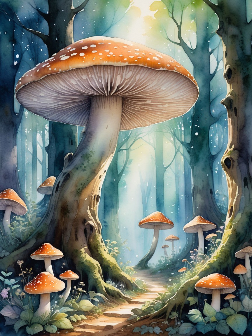 Prompt: An ethereal celestial being, composed of stardust and pure light, descends into a hidden grove filled with oversized, luminous mushrooms. The air shimmers with residual magic, and ancient runes are carved into the surrounding trees, suggesting a place of spiritual awakening. Soft watercolor washes define the organic shapes and glowing elements, creating a dreamlike, mystical ambiance, in the style of traditional watercolor painting with subtle, blended colors and visible brushstrokes, inspired by the ethereal works of Arthur Rackham and Yoshitaka Amano
