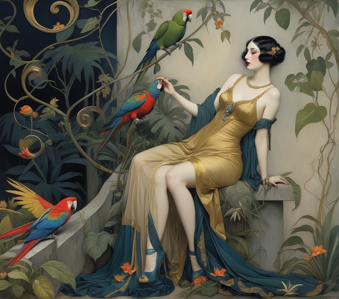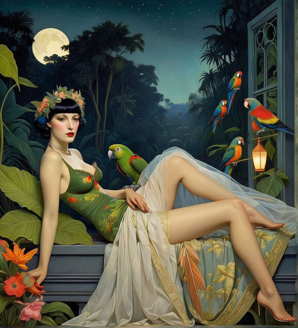 Prompt: Surreal jungle garden night Scene Beauty parrots in the style of Ingebjorg Froydis Stoyva.