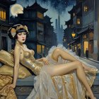 Prompt: A cinematic oil painting of a quiet, cobblestone village street at night, illuminated by the soft glow of hanging lanterns and the brilliant light of a full moon. The moonlight casts long, dramatic shadows and silvery highlights on wet cobblestones, creating a serene and mystical atmosphere. In the style of Tom Wänerstrand and John Moonan, with a moody color palette, visible brushstrokes, and a breathtaking wallpaper-worthy composition.