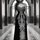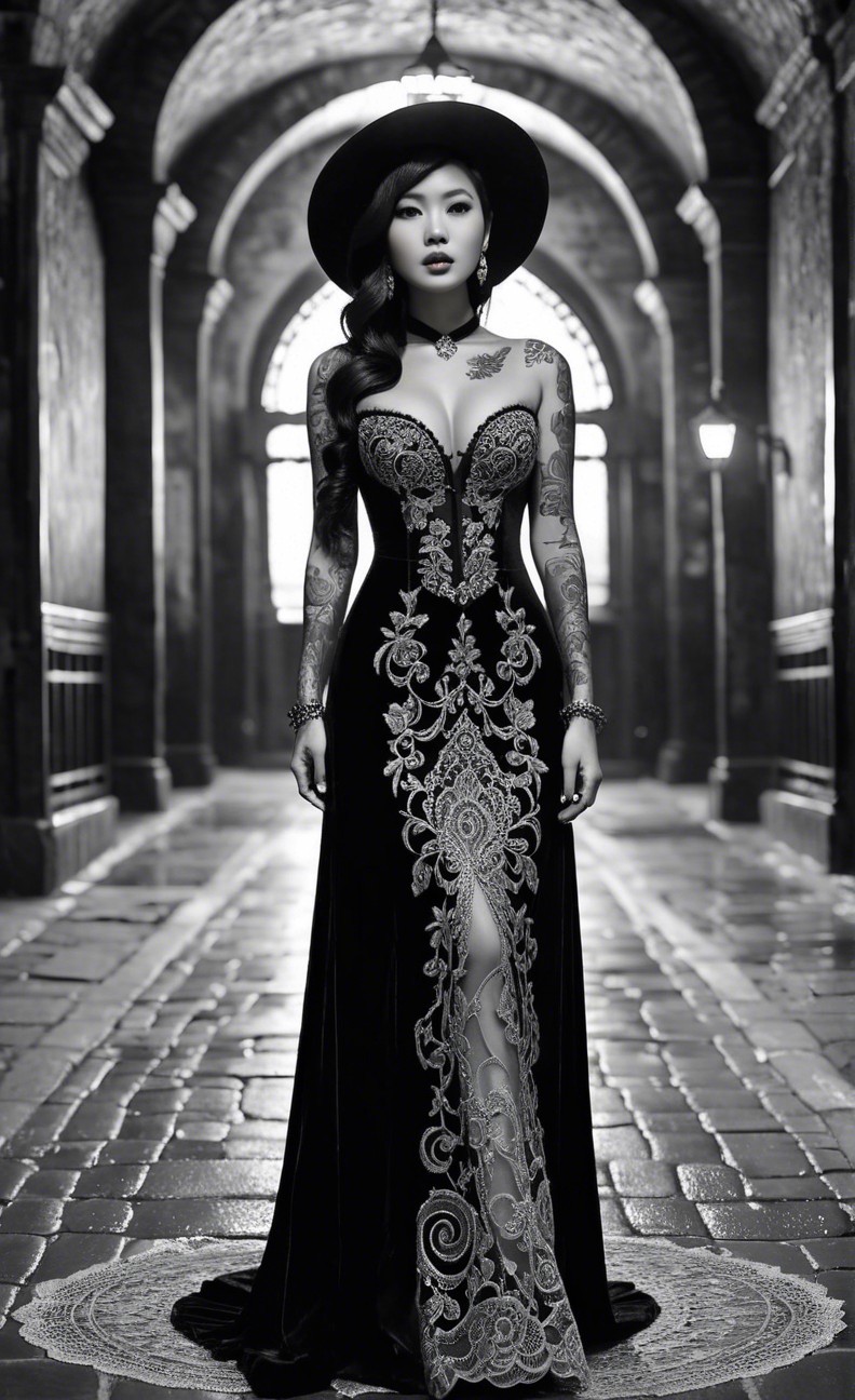 Prompt: cute thick volupotous body, thick hourglass body, Singaporean girl with intricate, swirling tattoos, wears a flowing, dark velvet very long dragging on the floor lacy intricate dress. stands on a wet-slicked cobblestone corridor in a dark dungeon, torches light up the path, dimly lit moody glow. wears a 1950's lacy hat covering a bit of her eye, textured realism of a faded photograph, melancholic atmosphere of film noir. evokes the sinuous lines of Art Nouveau, with a focus on organic forms and a palette of deep blues, blacks, and muted greys, big turquoise eyes, messy dark pink hair, thick plump body, very big chest, gold nose ring, thick thighs, big wide thick hips, bottom heavy body, thick legs, curvy thick, exotic fire red lips, straps around thighs, pantyhose, choker, rosy blushed skin. teasing the camera, exotic gravure model, sticking out her tongue, playful, joyful, smiling, rebellious attitude, long leather goth boots