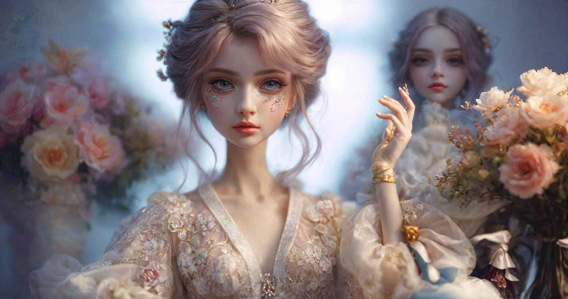 Prompt: 151515: [doll scene from "Grimes covers" by popovy sisters fragile]{beautyful fashion monsterluna, tears, clean, seek ,perfect skin serverstrakov, expensional, popovydolls, fantastic Girl}[A hyper-realistic depiction of a magical Illustration captured in a photorealistic style, with incredible details and vivid colors {artwork features whimsical designs reminiscent of art by Irina Ponomareva, Sveta Shubina, and Filipe K. This artwork is a masterpiece that emulates refined art and crisp quality definition}]
