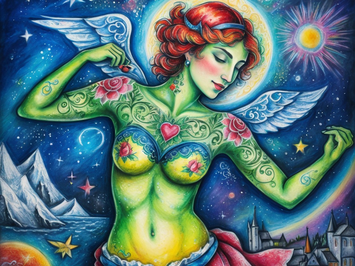 Prompt: Surrealism, vintage, Impressionist oil painting. New Year's Day new child born at the pond leaf. very detailed. style of Brom, Kevin Sloan, Jean Giraud, Tim White, Mucha, Dreamy, Mystical, seductive mood, full shot view, creation of the world by the goddess of the universe , glorious, magnificent and powerful. No one has ever seen anything like it before. ethereal colorful style of Gustav Klimt glowing translucent Catrin Welz-Stein illuminated absorbing (((Masterpiece))) Watercolor, wet on wet, ink and pen, alcohol wash, ephemeral, dreamlike, colourful naive art high contrast Henri Matisse Alex Grey Andy Warhol Ernst Ludwig Kirchner Tim Burton graffiti zentangle Francis Bacon Egon Schiele M.C. Escher Joan Miró Louis Wain Victo Ngai Enki Bilal art brut primitivism Jean-Michel Basquiat Raoul Dufy Romano del Ray abstract expressionism Ray Caesar Roberto Matta Adam Martinakis Arshile Gorky rauschenberg Tanya Shatseva Francesco Clemente Bridget Bate Tichenor fnord zebadri Psychosomatic surrealism Gayane Khachaturian surrealism, vintage canvas. 8k