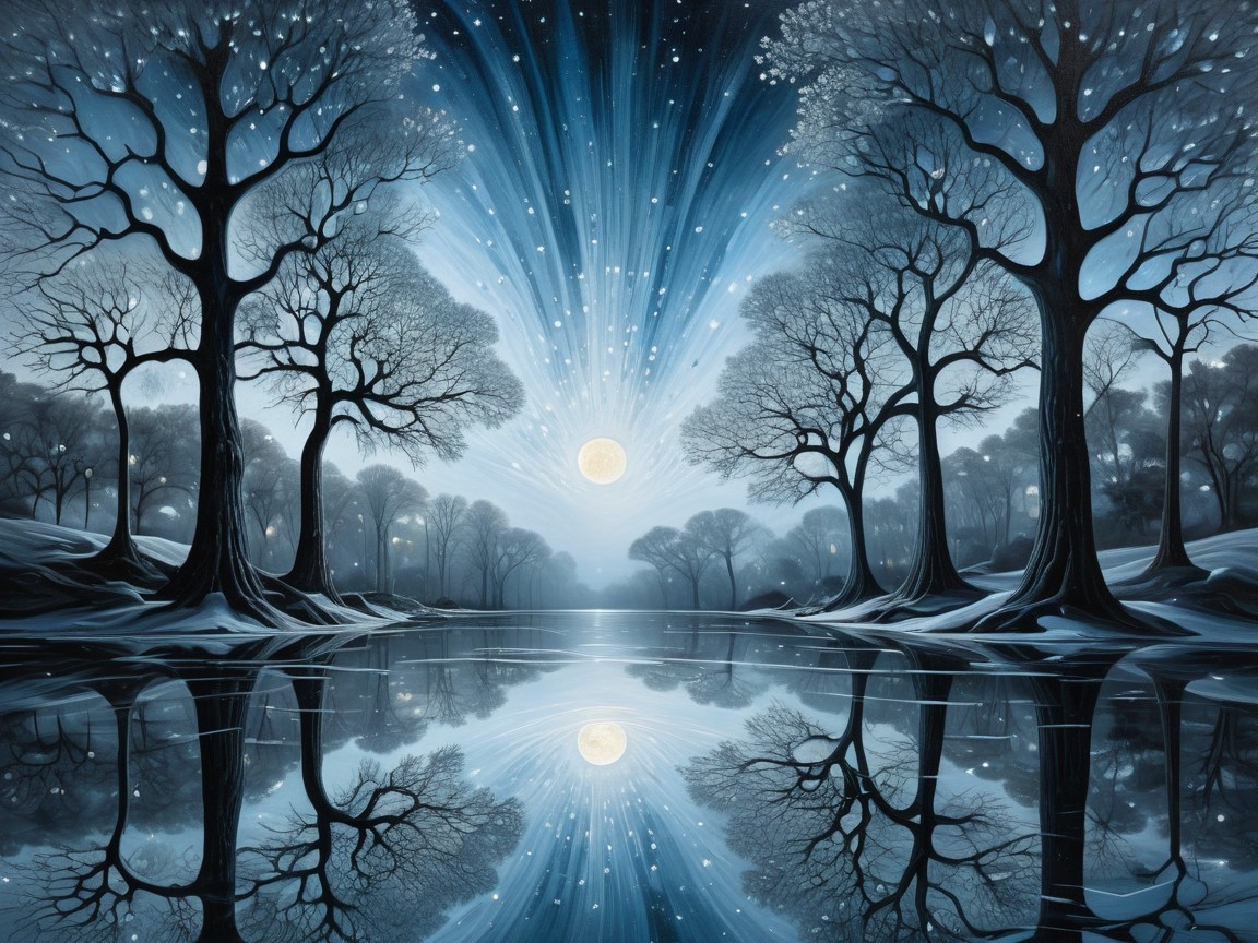 Prompt: A surreal vision: a melancholic spirit contemplates its own world in the night. A duality between consciousness and dream. Non-photographic, feminine, an X-ray of luminous whiteness. Fluid contours, translucent and ethereal textures. The atmosphere is calm, bathed in a cold light. Abstract and dreamlike, digital art and spiritual painting.