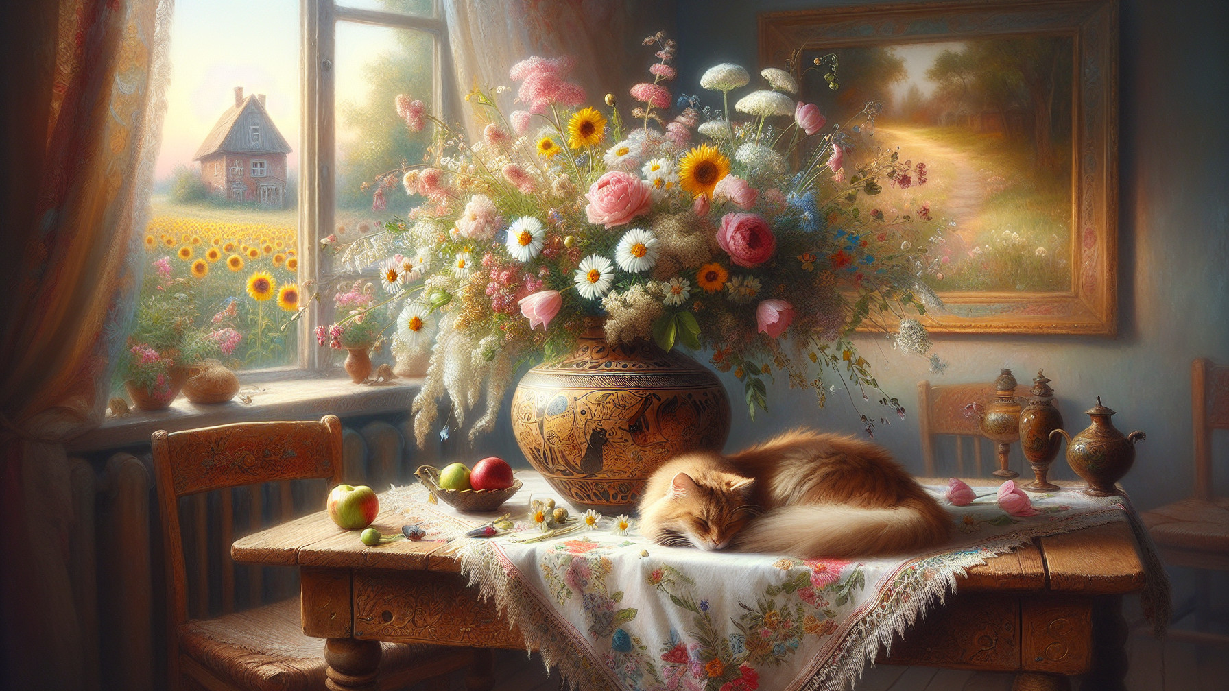 Prompt: Fairytale spring still life indoors. Wooden table covered with an embroidered cloth. An ornate, antique ceramic vase with delicate gold and folkloric patterns, filled with romantic wild spring flowers — tulips, daisies, roses, and soft meadow blooms in pastel yet vibrant tones. No fruits on the table. A peaceful cat sleeping on the table, facing the viewer. Soft glowing daylight fills the room. Through a window, a cozy house with its garden and a distant sunflower field beneath a dreamy pastel sky. Whimsical fairytale mood, painterly realism, soft luminous light, rich textures, gentle glow, dreamy atmosphere.