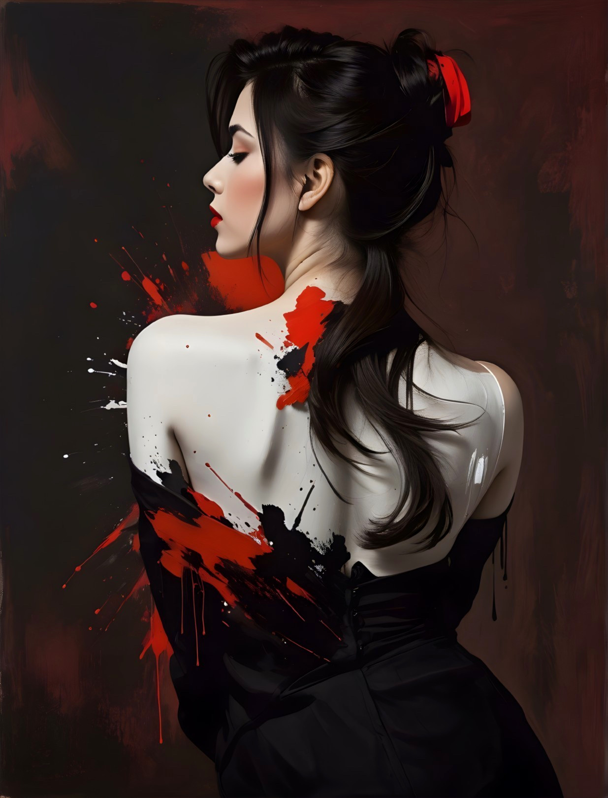 Prompt: Alluring Splashes of Beauty and Grace: Side view of a woman's back, tricolor silhouette, Neo-Abstract style with explosive brush strokes, dark color splashes, red, and gestural marks, reminiscent of Ashley Wood's dynamic compositions, set against a high-contrast, tricolor context background with a subtle Dutch angle, incorporating Wabi-Sabi principles, ink, and watercolor textures, with blotches of black paint, censored areas, in a Half-Turn Rear View, evoking emotional intensity and chaotic energy, with a raw, expressive aesthetic.
