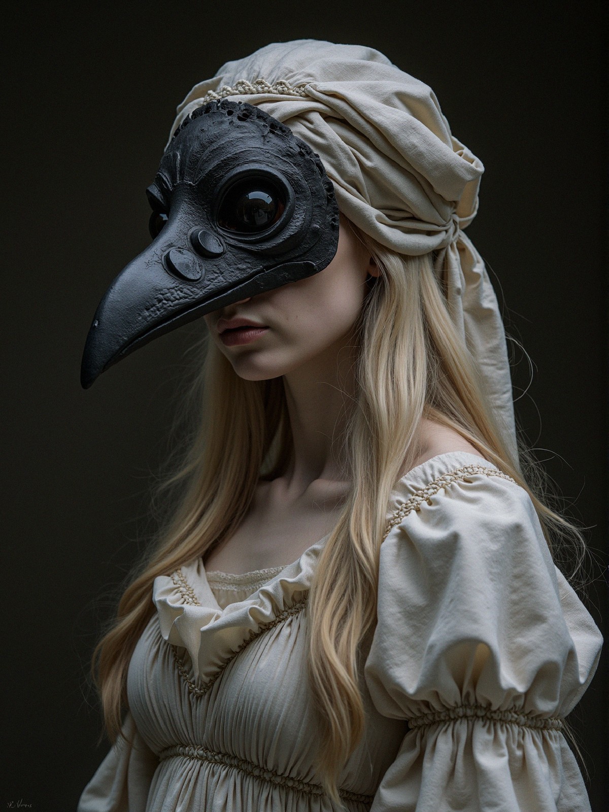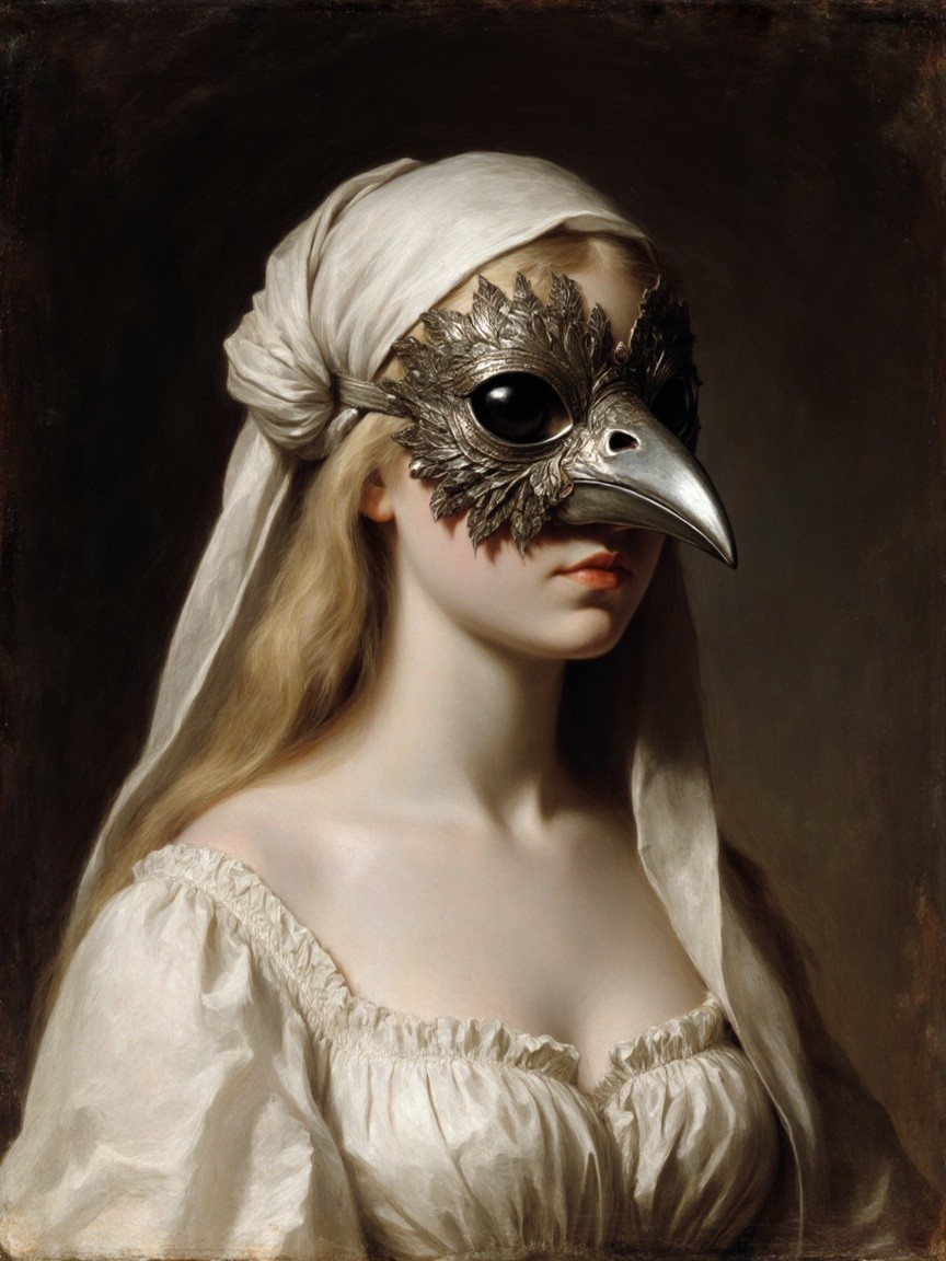 Prompt: Portrait of a young woman with pale skin and long blonde hair, wearing an elaborate bird mask with large, glossy black eyes and a long, pointed beak, draped fabric head covering, a flowing white muslin gown with gathered neckline, Baroque painting style, muted earthy tones, soft diffuse lighting, chiaroscuro effect, subtle textures throughout, somber introspective mood, shallow depth of field, medium close-up perspective, symmetrical composition, dark neutral background.