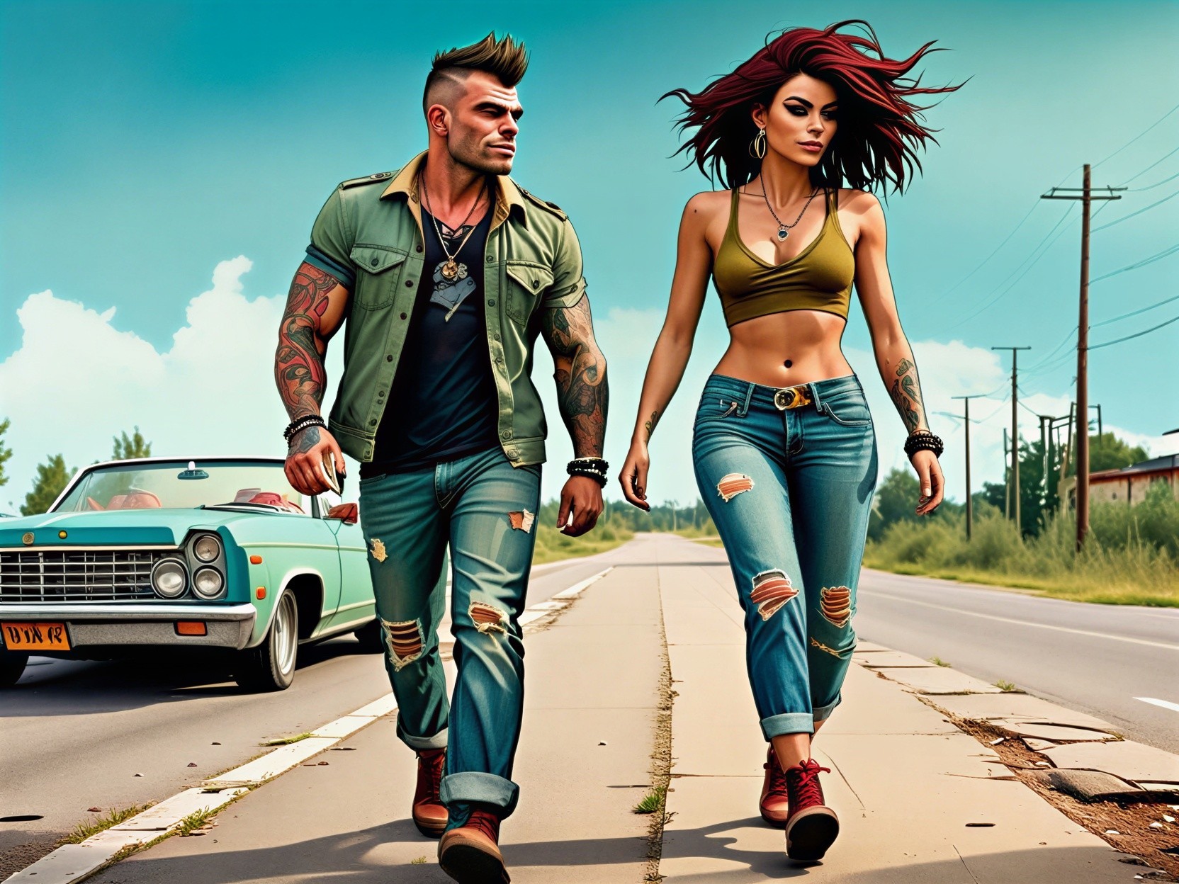 Prompt: In the style of Miró, Klimt, Kandinsky, or in a patchwork style, an illustration of a female figure in a vibrant, surreal garden is to be created. The woman has spiky, orange hair and a medium to light skin tone, radiating self-confidence. She wears a modern green patterned dress, stands upright with a calm expression and slightly averted gaze. Around her, a riot of color unfolds, with large leaves and intricately designed butterflies, dominated by shades of red, pink, blue, green, purple, and orange. The background should be filled with large, stylized leaves, some outlined in black, and butterflies with elaborate patterns fluttering among them. The composition should combine bold colors and fine lines, creating a captivating fusion of natural forms. The female figure should be positioned slightly to the left to allow sufficient space in the background for the colorful leaves and butterflies, some of which are depicted in great detail. The overall tone should be playful and dreamy, capturing the essence of a surreal plant landscape.