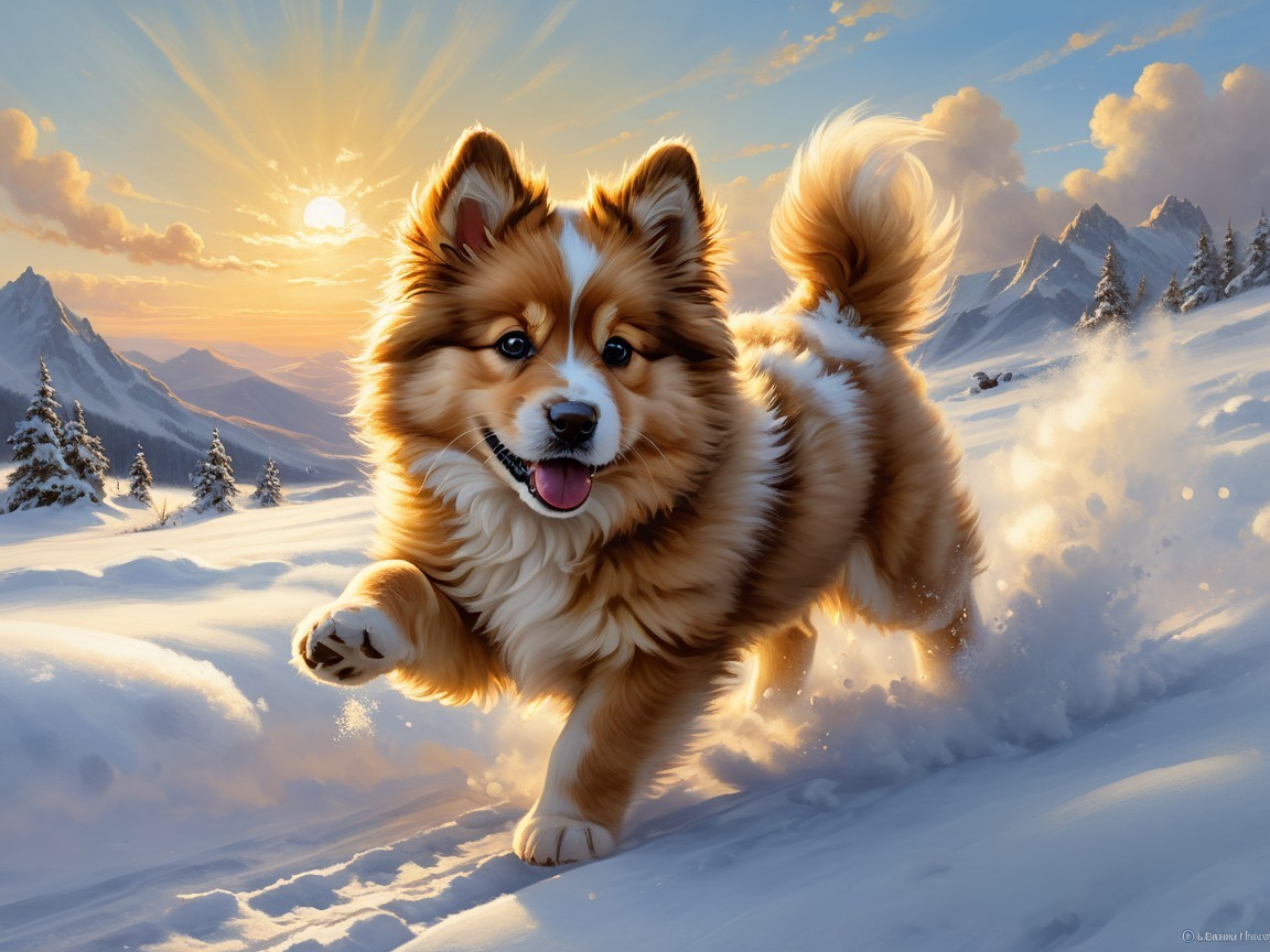 Prompt: cute amazing fluffy puppy in winter, he rages in the snow, fluffy clouds, great golden sunlit,