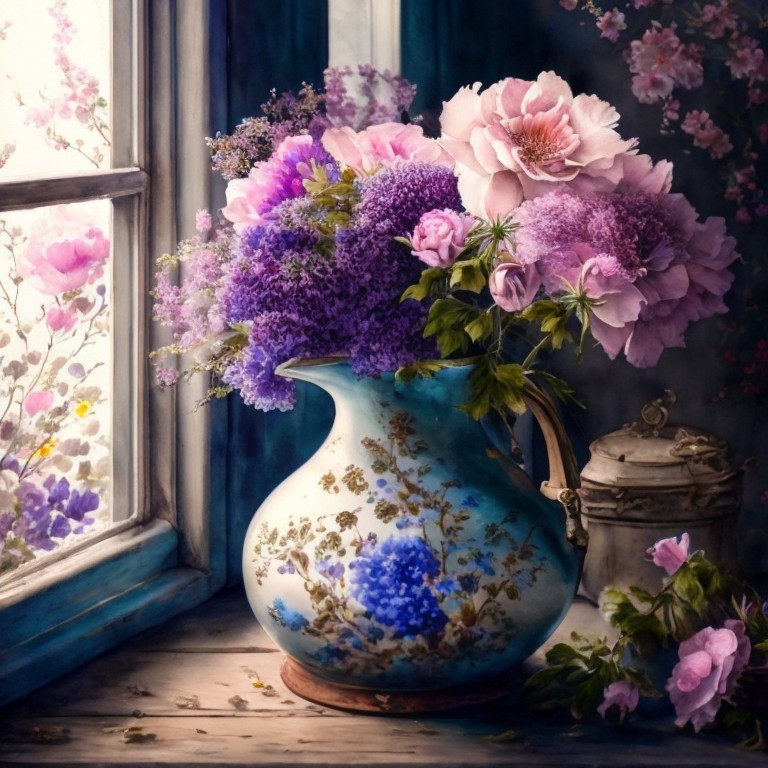 Prompt: watercolor technique of Guan Weixing, old flowers bouquet in old pott, blue mystic haze, alla prima watercolor technique, pastel colors, first person view, On an antique wooden table, lace doily, in a corner next to a window with a view of a garden, some petals fallen on table