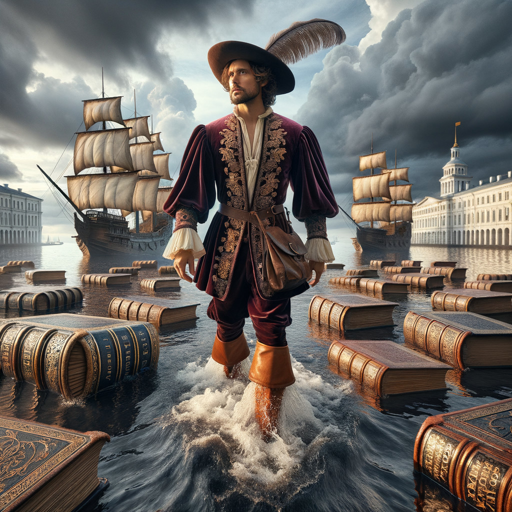 Prompt: A photorealistic, high-resolution HDR scene with crisp clarity and no vintage or yellow tint. The composition features a man walking through shallow, realistic water that flows from between massive antique books arranged vertically like a bookshelf. The water is intricately rendered with dynamic ripples, reflections, and subtle wave motion, leading into a harbor scene with sailboats and classical buildings under a dramatic, cloud-laden sky.** **The man now wears a Renaissance-inspired explorer’s outfit: a wide-brimmed feathered hat, a deep burgundy velvet doublet with gold embroidery, cream-colored puffed sleeves, and high leather boots. A leather satchel hangs from his shoulder, and a rolled map is tucked under his arm. His cloak is replaced with a tailored capelet that flutters slightly in the breeze. His posture remains confident and purposeful as he strides through the water.** **The books are richly textured, oversized, and ornately bound, with Cyrillic titles including: "Handbook" "Dictionary" "Dictionary of Foreign Words" "Dahl's Dictionary" and "Dictionary of Ancient Literature". Their spines are detailed with embossed patterns and aged leather tones, yet the overall palette remains clean and modern—no sepia, no blur, no watermark.** **Lighting is cinematic and directional, casting soft highlights across the water and the folds of the explorer’s garments, with deep shadows enhancing the dimensionality of the scene. The color palette is rich and balanced, blending warm browns, cool blues, and neutral greys with high color depth and glossy finish. The background seamlessly merges the literary shelf with the maritime harbor, maintaining consistent lighting and visual depth across the entire frame.** **Aspect ratio 9:16, No signatures, no watermarks. Art style: hyper-realistic surrealism with narrative symbolism—blending tactile realism with imaginative storytelling.