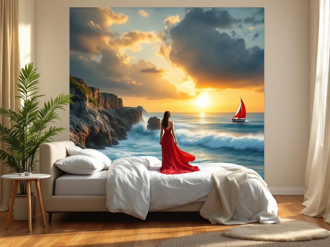 Prompt: A crisp, ultra-detailed surreal bedroom scene. A modern bed with white sheets transforms into a realistic ocean landscape printed across the bedspread. Waves crash against rocky cliffs at the foot of the bed. A woman in a flowing red dress stands on the cliff edge, gazing toward a red sailboat sailing into a golden sunset. The sky is dramatic, filled with warm light and layered clouds.