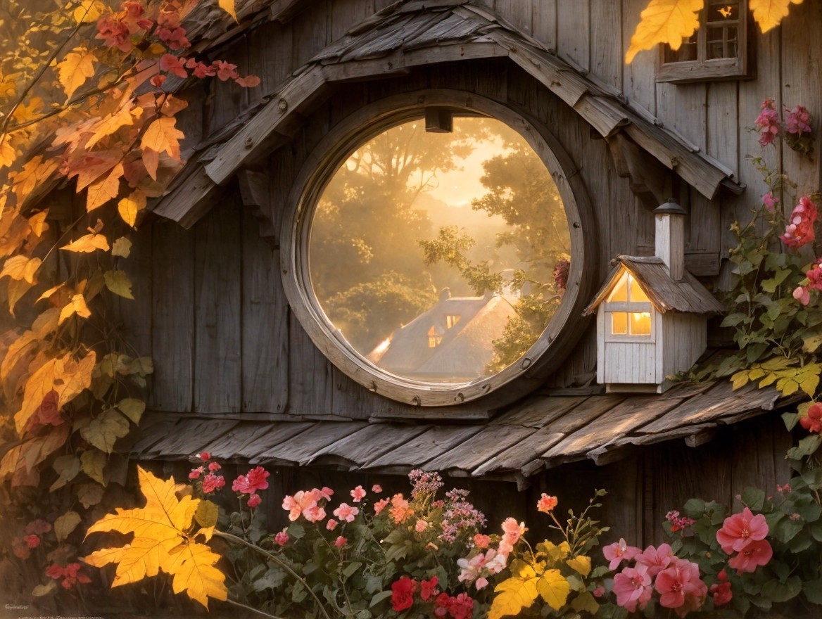 - **Setting**: The background features lush green foliage (leaves, vines) and twisted rope - like structures (suggesting a porch or garden swing). Small white flowers with yellow centers are visible near the bottom right. The backdrop has muted, earthy tones (browns and greens), creating a serene, natural atmosphere.