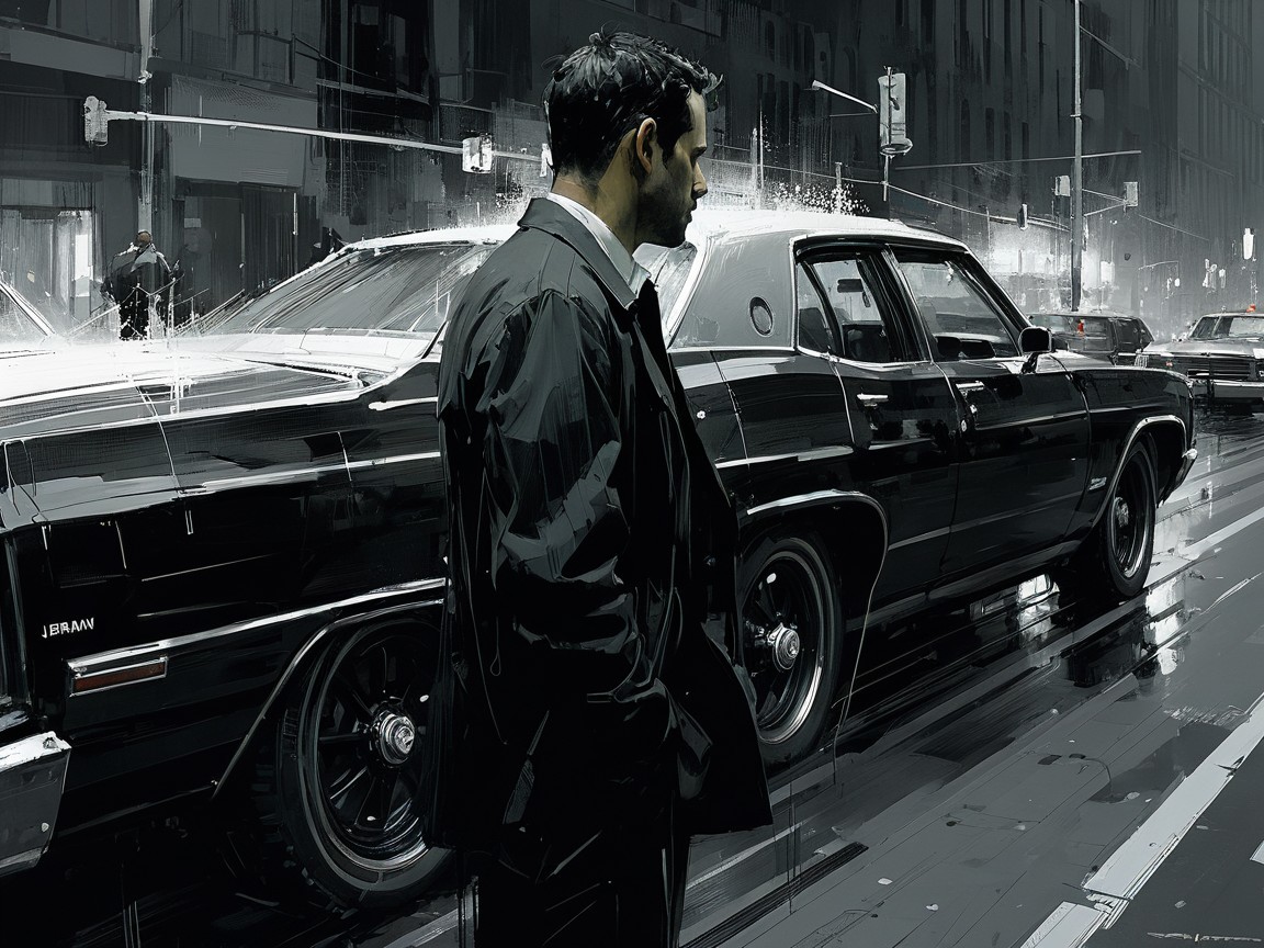 - **Rain**: Streaks of white paint slant diagonally across the canvas, vividly conveying heavy rainfall.