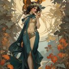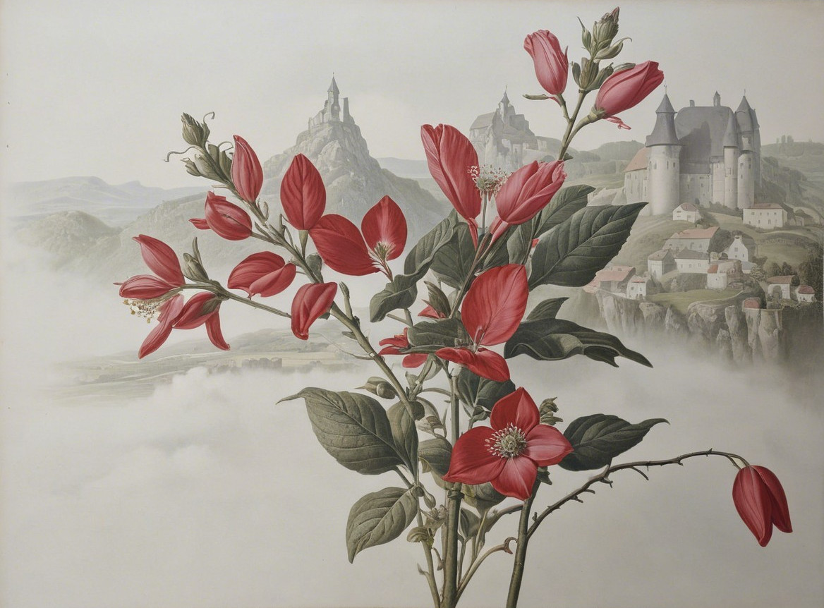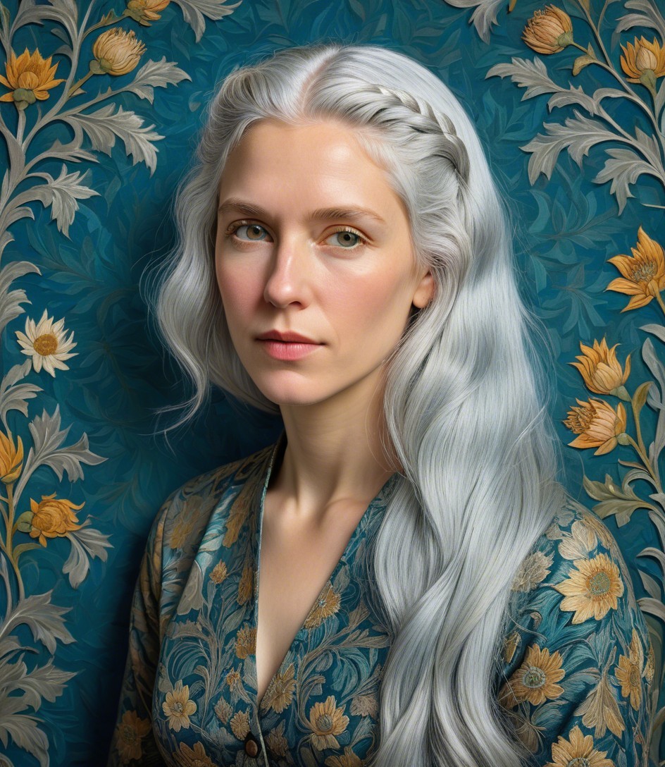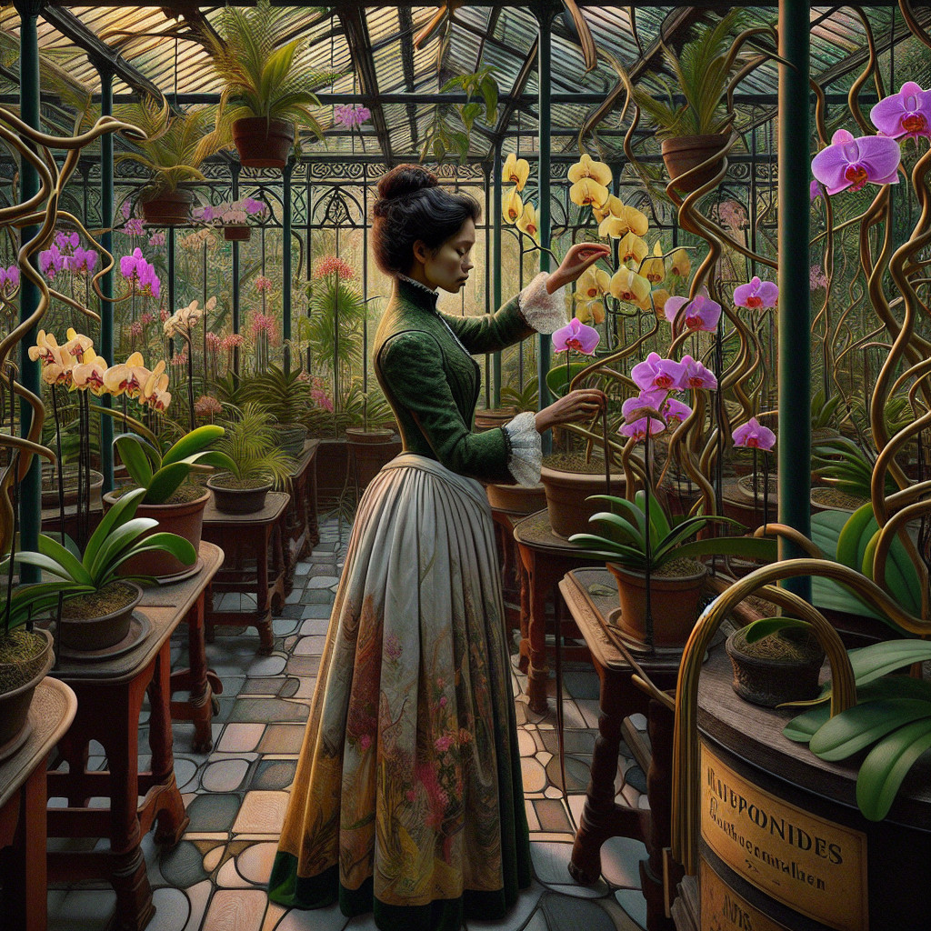Prompt: A woman meticulously arranging poisonous orchids in a greenhouse labyrinth, her Victorian mourning dress woven from Monet's water lilies while the glass panes distort into Picasso's cubist fragments, masterpiece-level botanical accuracy by Maria Sibylla Merian meets Alphonse Mucha's art nouveau curves, hyperrealistic humidity beads on antique copper pipes, Dutch Golden Age lighting cutting through jungle steam with Vermeer's precision.