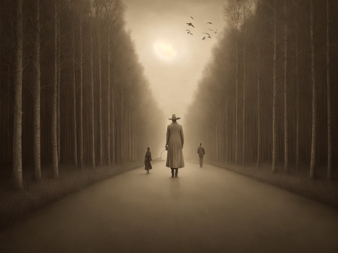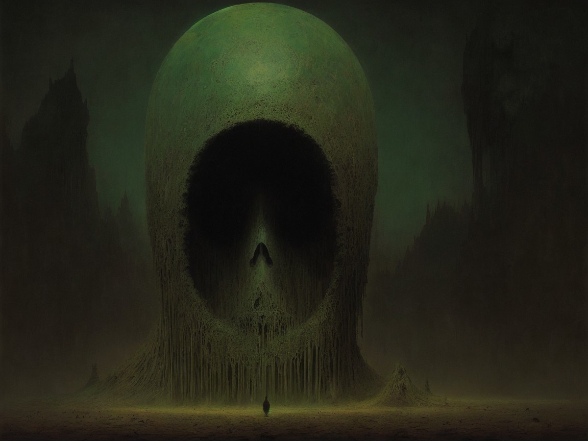 Prompt: a very surrealistic and hyper abstract sepia / deep green graphics on preparaded old looking canvas presenting the way in which human is so lonly creature with amazing creativity ideas.In masterpiece pure style of beksinski