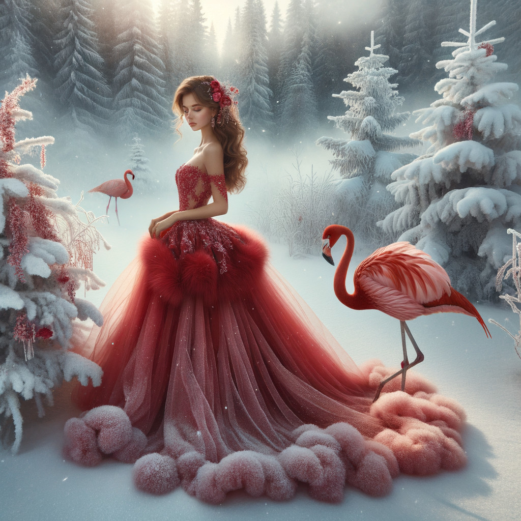 Prompt: In a whimsical winter landscape, a young woman stands gracefully amidst a blanket of soft, white snow, dressed in an exquisite red gown. The gown flows elegantly around her, mirroring the movement of the snowflakes gently drifting from the pale sky. Beside her, a striking flamingo perches, its vivid crimson feathers creating a vivid contrast against the serene, frosty backdrop of tall evergreens dusted with snow. Soft lighting casts a magical glow, illuminating the scene with an ethereal quality, while delicate floral accents in her hair reflect the warmth of her attire. The overall composition combines elements of fantasy and beauty, evoking a dreamlike atmosphere that harmonizes nature with elegance.