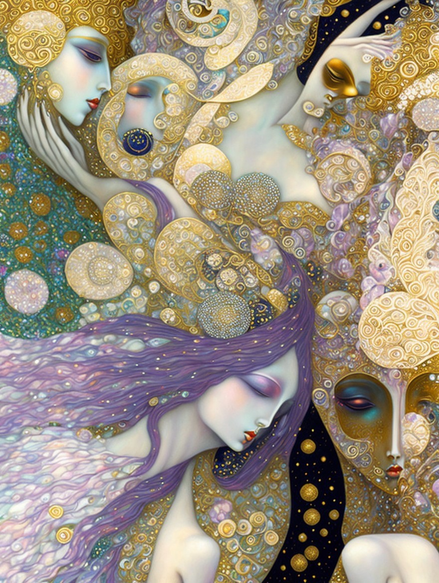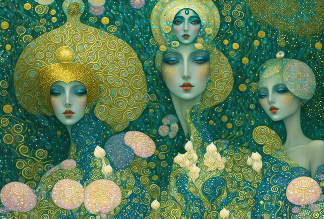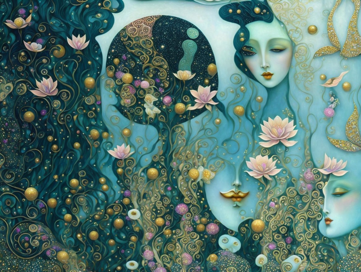 - **Celestial Sphere**: A large, textured golden orb (resembling a moon/sun) hangs above the table, connected by thin lines to the central and right figures’ heads—suggesting a symbolic or psychic link.