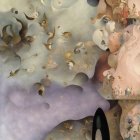- **Background**: The upper edge features a textured golden band with black birds perched on it; the rest is a dark, smoky brown, creating an atmospheric, surreal depth.