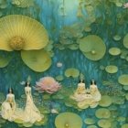 The composition balances human presence with the overwhelming force of nature, using color and line to immerse the viewer in a tranquil yet rainy moment.