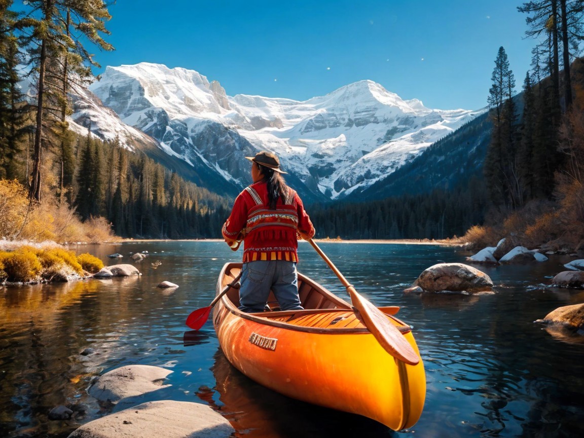 Prompt: Front view of a Native American paddling a canoe on a river through a forest surrounded by rocky, snow-capped mountains. Spring-like weather with some sunshine.