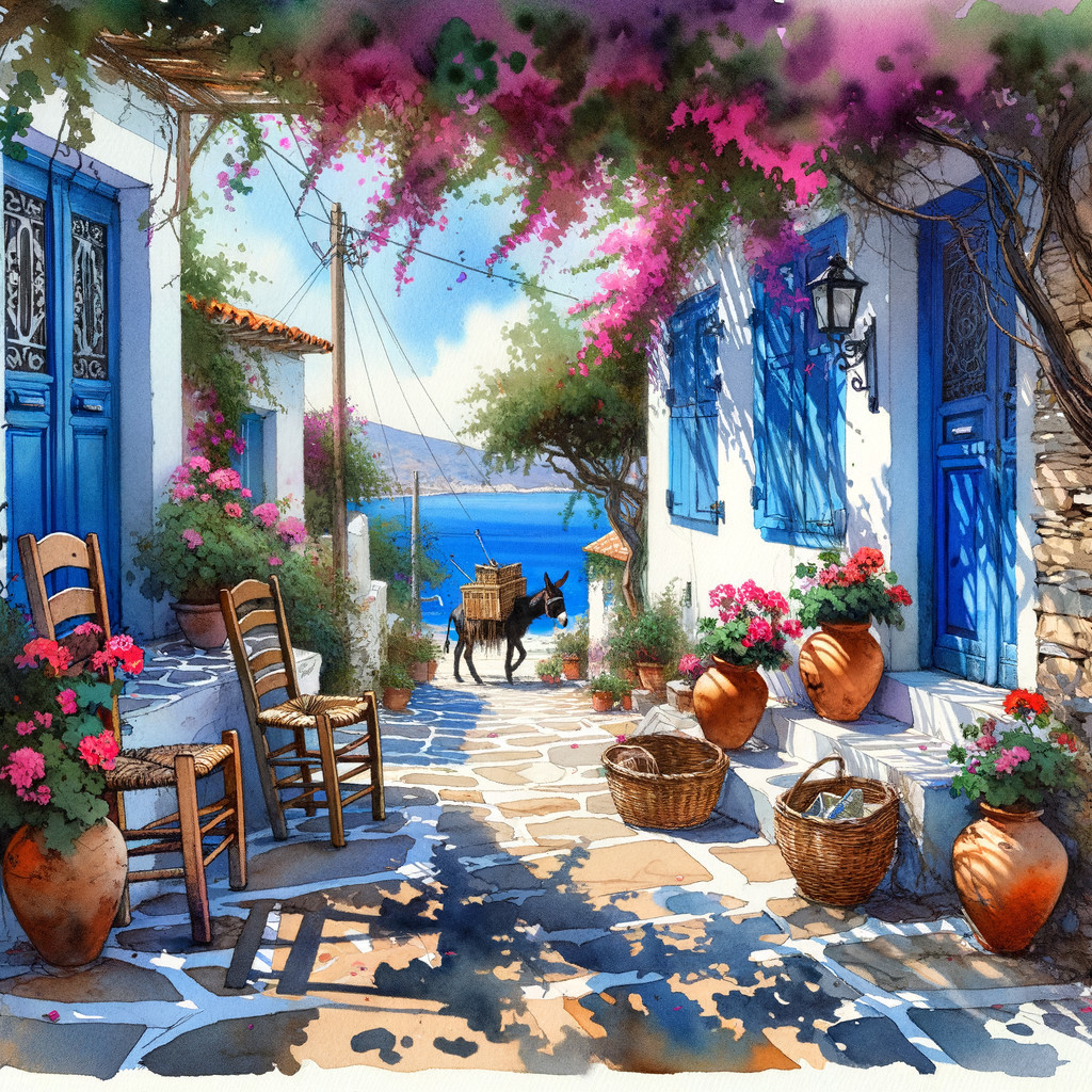 Prompt: Impressionist Watercolor and ink, alcohol wash, very loose brushstrokes in the style of Thomas W. Schaller.Create a Greek street with blue doors ond old wood chairs, Bouganvillea makes an arch creating shadow spots, a lonely donkey woth baskets walks along the street. Terracotta vases with pelargonium on the stone stairs on the side of a house, you may see the sea at the end of the street. Strong light contast