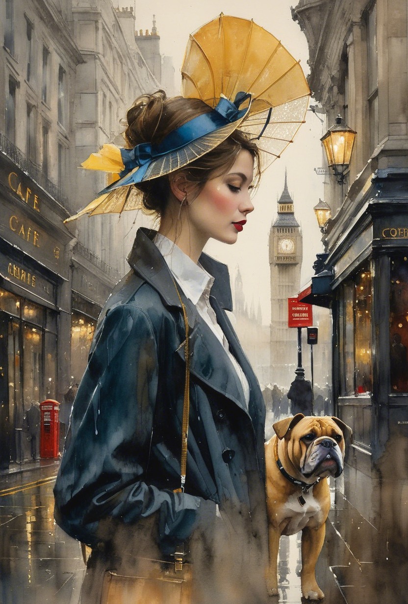 Prompt: draw me.* <wet-on-wet watercolor,rich,colorful>.* <in the style the watercolours of Jeremy Mann , flat brush >.* A darkly painted facade of a London cafe with large cloisonné windows, next to the cafe stands the famous red telephone box, a man in an elegant dark grey coat with a white bulldog on a leash comes out of the cafe. an early autumn morning with sparing light. a drawing in a strict style with a silent atmosphere.