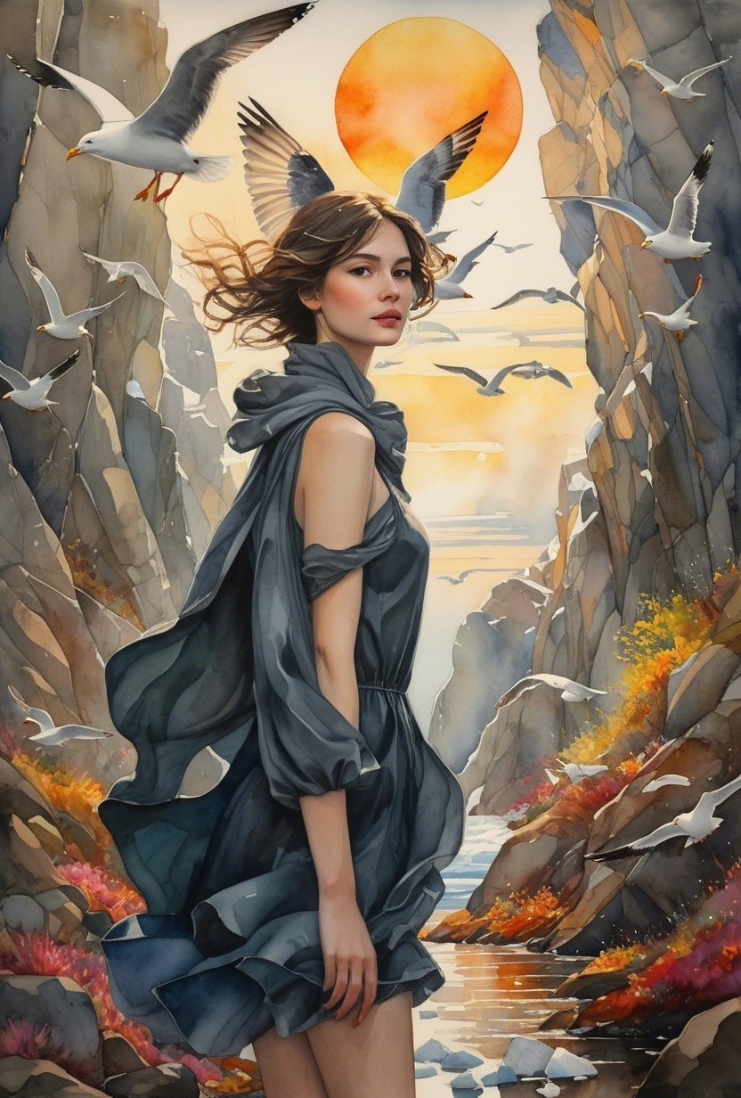 Prompt: please draw me.*<wet-on-wetwatercolor,rich,colorful>.* a picture of the grey stone shore of the dark northern sea, where in the rays of the rare bright arctic sunshine gulls wander, those who are bolder land on floating ice floes, others fly.* far away in the haze above the water rise like a wall of icebergs, illuminated by the sun.* a fascinating picture of the silent harsh far north on a rare sunny day, inspired by the works of Thomas Wells Schaller.