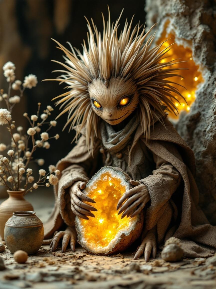 Prompt: Create a whimsical fantasy portrait of a mysterious creature with a smooth, carved wooden mask-like face and radiant quill-like hair, sitting among massive geode crystals split open to reveal gold and amber interiors. The creature wears an old, textured coat and gently cradles the luminous stones as if guarding ancient secrets. Surround it with tiny natural details—dusty flowers in a ceramic vase, cracked earth, soft ambient light—to evoke a magical, handcrafted, storybook atmosphere full of quiet wonder.