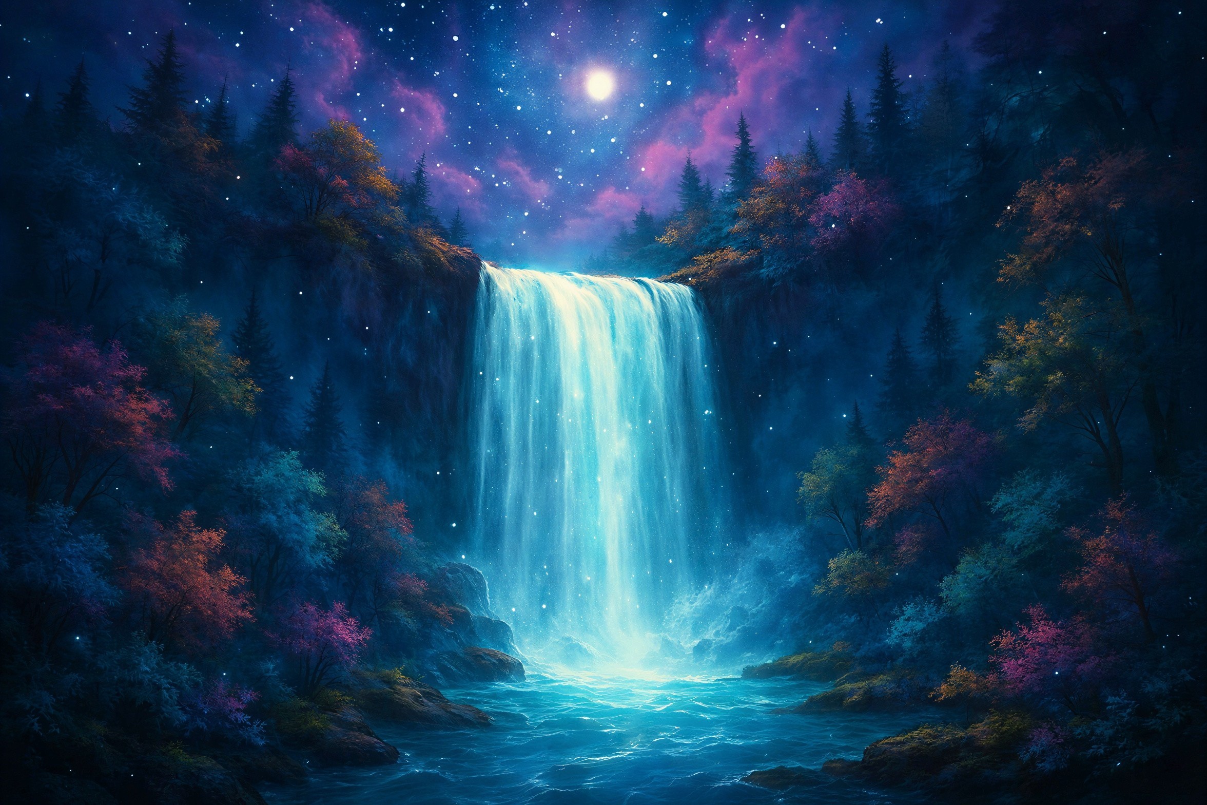 Prompt: A Chinese forest at night under a full moon, with scattered stars in the dark sky, shadows creating a swirling effect on the trees and waterfalls in Van Gogh’s technique.