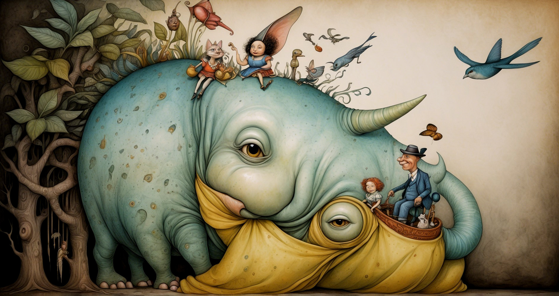 Prompt: New surreal world elegant fantasy Daniel Merriam Catrin Welz-Stein Anton Pieck Daria Petrilli Hugo Pratt