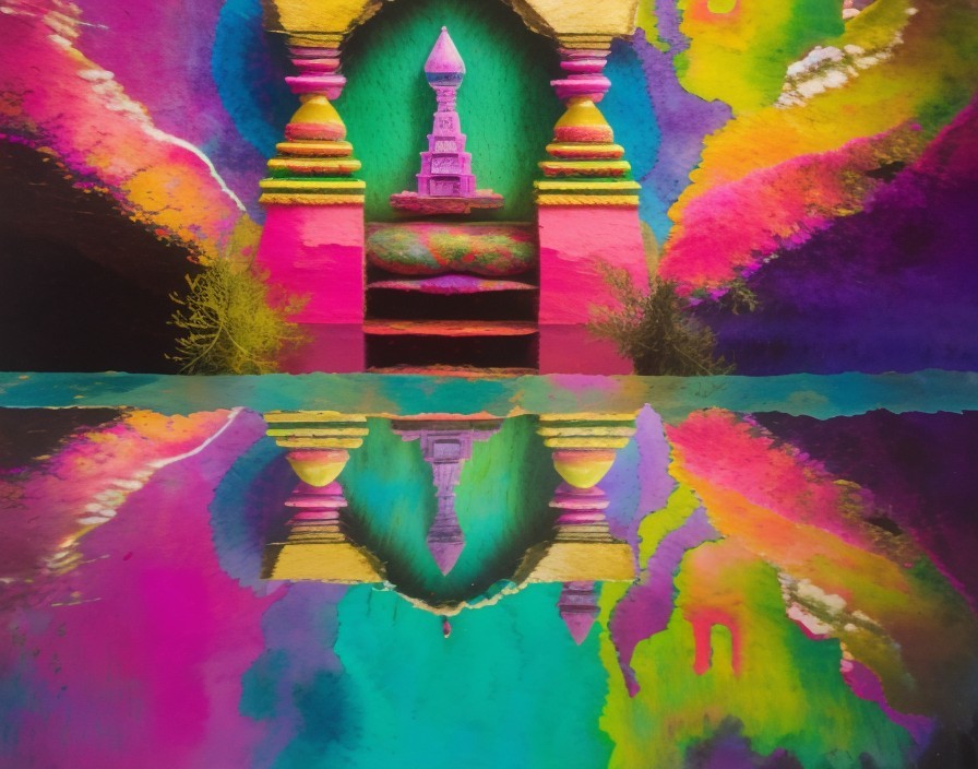 Prompt: Create an image featuring a vibrant and surreal interior reminiscent of a highly stylized Indian temple. The perspective is wide-angle and dynamic, with a focus on an elaborate altar in the center. Objects and architectural features are adorned with intense, almost neon colors in red, blue, green, and purple, producing a psychedelic effect. The image appears to be viewed through anaglyph 3D glasses, with noticeable red and blue chromatic aberration that gives a sense of depth and distortion, making it feel otherworldly.The temple is filled with intricate carvings and statues of deities and mythical figures, rich with cultural symbolism and historical significance. The statues are ornate, with visible jewels and headdresses, contributing to a majestic yet enigmatic atmosphere. Walls are decorated with hieroglyphic-like symbols and patterns. Include a checkered black-and-white floor that enhances the optical illusion of the space bending. The ambient lighting should cast soft shadows that subtly blend with the vivid colors, accentuating the dream-like quality of the image.
