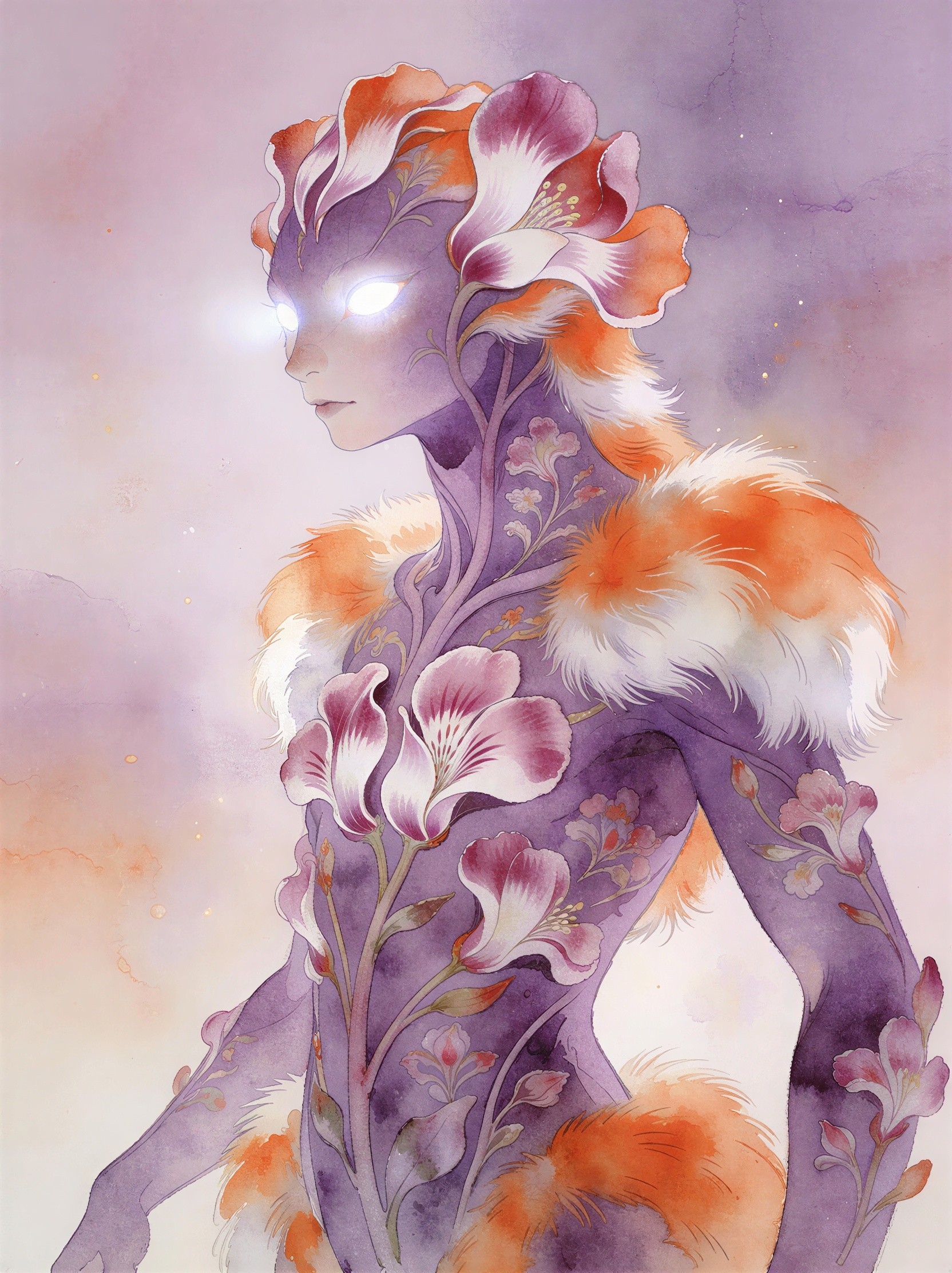 Resulting in a mesmerizing fusion of chaos and fantasy. fine-tuned stylised watercolour surrounded by splashy white space,gorgeous beauty,féminity and grâce