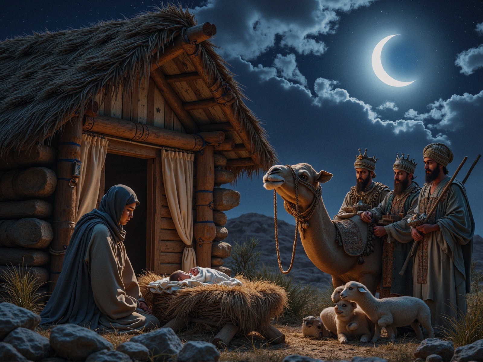 Prompt: Ancient hut with thatched roof, mysterious woman draped in a shroud, rugged man tending to a wooden manger cradling a newborn baby, gentle lambs grazing nearby, night setting with a crescent moon illuminating a starry sky, a brilliantly shining star of Bethlehem above, three kings adorned in lavish attire and turbans bearing gifts, a majestic camel adorned with intricate ornaments, intricate and detailed fantasy art piece capturing the essence of the nativity scene.