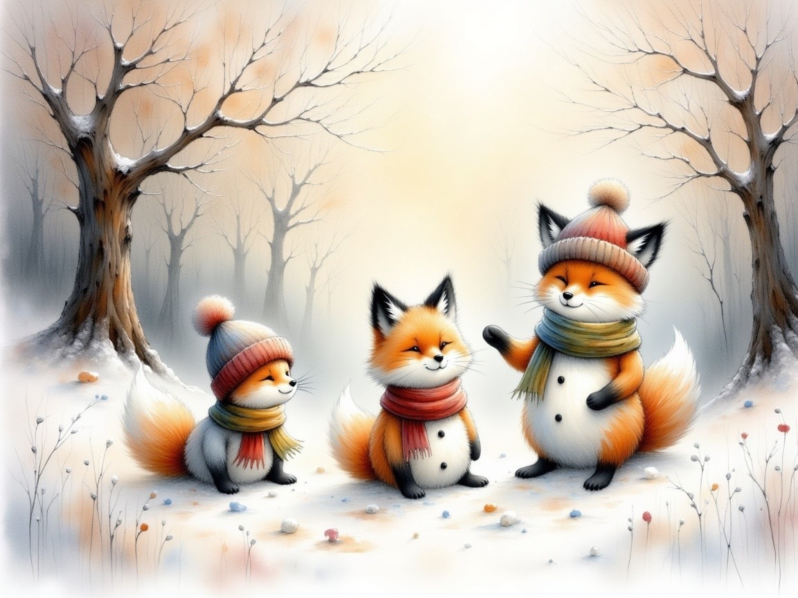 Prompt: Cozy winter village, snow-covered cottages, winding cobblestone paths, smoke rising from chimneys, twinkling fairy lights, quaint wooden bridges, frozen river, snow-capped pine trees, whimsical clock tower, vintage street lamps, friendly snowmen, ice skating pond, children building snowmen, warm pastel color palette, soft glowing lights, magical atmosphere, enchanting snowfall effect, detailed textures, dreamy and fantastical style, by Mary Blair and Brian Froud, Pinterest for inspiration, high resolution.