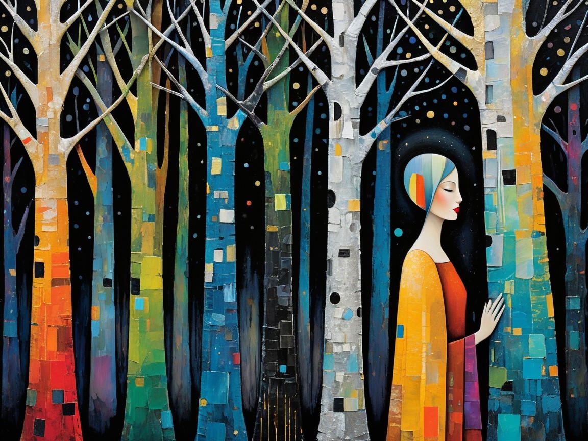 Prompt: Grunge textured, abstract, figurative, impasto mixed media painting with paint splashes, side portrait among fantastical, dreamlike, melancholic trees with iridescent metallic colors, silver and black lines, style Klee, Amanda Clarke, Andy Kehoe, Inge Shuster, Catherine Hyde, Odilon Redon, Angelina Wrona, Feininger, Klimt.