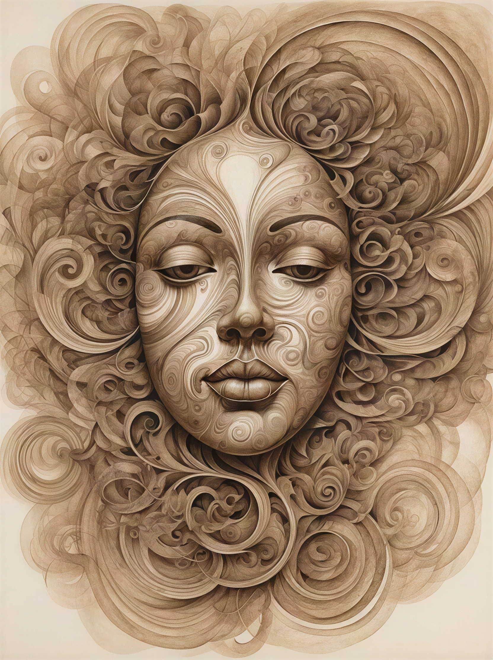 Prompt: This is a sepia-toned drawing that showcases an abstract depiction of a face surrounded by swirling lines. The intricate detailing gives the impression of smoke or clouds, adding a sense of movement and depth to the piece. A distinct feature is the inclusion of what appears to be a trumpet, with its detailed curves and structure, which extends from the lower part of the image. The overall effect is one of surrealism and ethereal beauty, blending human features with elements that suggest music or sound.