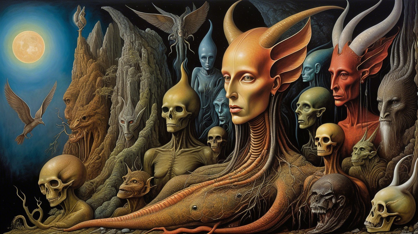 Prompt: Land of broken Dreams and Fallen Angels, mystical muses and cryptid creatures: A Surreal Fantasy Painting by the Mystic Otto Rapp under the Influence of funny bone extract with ayahuasca, inspired by Ernst Fuchs, H.R. Giger and Beksinski, oil paint on canvas, detailed strokes, psychedelic collage, cryptid taxidermy in Bogomils Universe, imperial colors